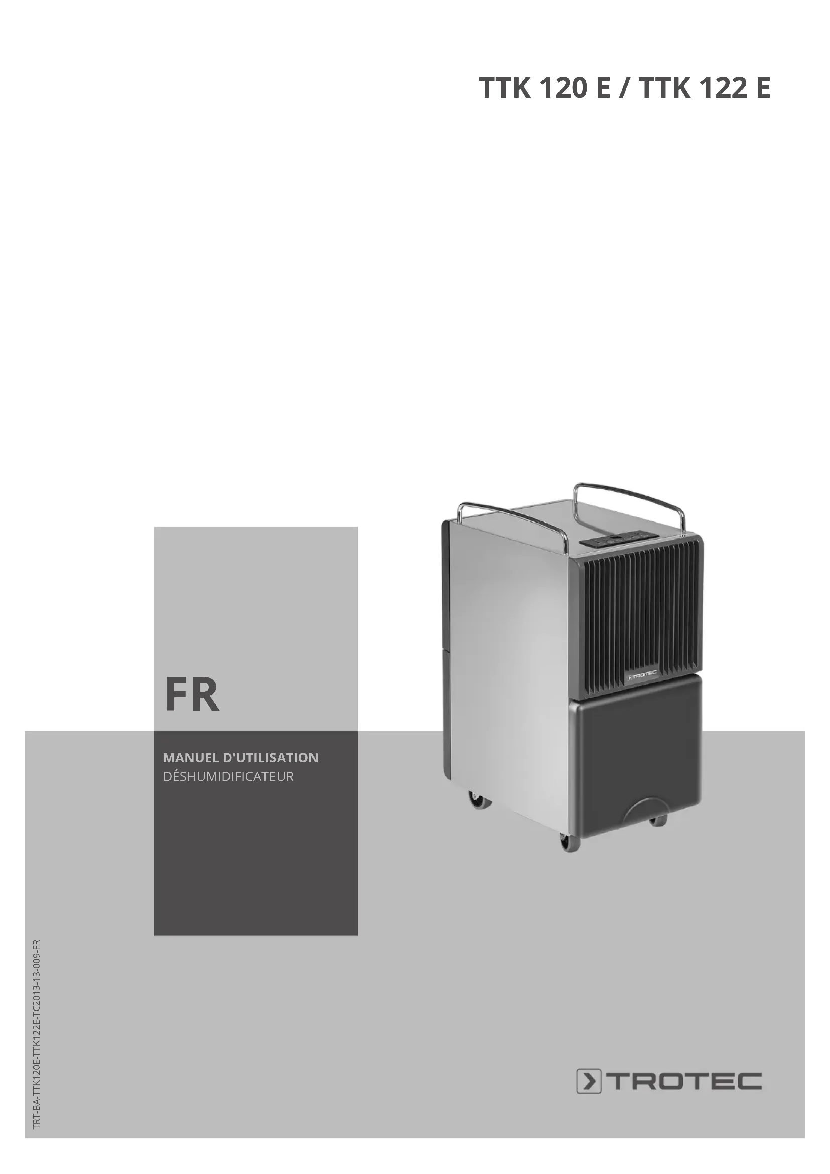 Observer le manuel d'utilisation Ce symbole rappelle la nécessité de lire et d’observer le manuel d'utilisation. Observer les instructions de réparation Tout travail d’élimination, de maintenance ou de réparation sur le circuit réfrigérant doit être effectué exclusivement en conformité avec les consignes du fabricant et par des personnes en possession d’un certificat de compétence. Les instructions de réparation correspondantes sont disponibles sur demande auprès du fabricant.FR 5 déshumidificateur TTK 120 E / TTK 122 E Risques résiduels Danger Réfrigérant naturel propane (R290)! H220: gaz extrêmement inflammable. H280: contient du gaz sous pression; peut exploser sous l'effet de la chaleur. P210: tenir éloigné de toute source de chaleur, des surfaces chaudes, des étincelles, des flammes ainsi que de toute autre source d'inflammation. Ne pas fumer. P377: gaz effluent en feu: ne pas éteindre tant que la fuite ne peut pas être colmatée sans danger. P410+P403: conserver à l’abri du soleil dans un endroit bien aéré. Avertissement relatif à la tension électrique Toute intervention au niveau des composants électriques est à réaliser exclusivement par une entreprise spécialisée! Avertissement relatif à la tension électrique Retirez la fiche d'alimentation de la prise secteur avant tout type d’intervention sur l’appareil. Ne touchez jamais la fiche secteur avec des mains humides ou mouillées. Débranchez le cordon secteur de la prise électrique en tirant sur la fiche secteur. Avertissement L'utilisation de l'appareil peut comporter un risque s'il est utilisé par des personnes non compétentes ou en cas d'utilisation non conforme ou non conventionnelle! Observez les qualifications requises pour le personnel. Avertissement L'appareil n'étant pas un jouet, il n'est pas adapté aux enfants. Avertissement Danger de suffocation! Veuillez ne pas laisser traîner les emballages vides. Ils pourraient être dangereux pour les enfants. Remarque N'utilisez jamais l'appareil sans filtre à air monté sur l’entrée d'air. Sans filtre à air, l'intérieur de l'appareil se salit énormément, ce qui peut réduire les performances et détériorer l'appareil. Comportement en cas d’urgence