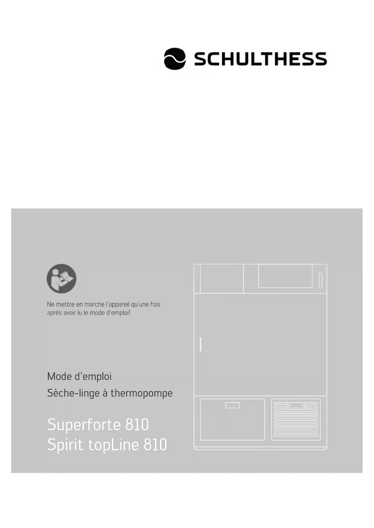 - Ne mettre en marche l’appareil qu’une fois après avoir lu le mode d‘emploi! Mode d’emploi Sèche-linge à thermopompe Superforte 810 Spirit topLine 8102 Symboles Lisez les instructions. Les avertissements de sécurité sont précédés d’un triangle de signalisa- tion. Il est indiqué comment éviter le danger. Les avertissements caractérisent la gravité du danger qui survient si celui-ci n’est pas évité. Avertissement indique que de graves dommages corporels, voir même un danger de mort peuvent survenir. Attention indique que des dommages aux biens peuvent survenir.3 Chère cliente, cher client Nous sommes fort heureux que vous vous soyez décidé pour un sèche-linge Schulthess. Votre nouveau sèche-linge est le fruit de plusieurs années d’efforts de développement. Des normes de qualité extrêmement rigoureuses en matière de conception et de fabrication lui garantissent une longue durée de vie. Sa conception répond à toutes les exigences actuelles et futures de l’entretien moderne du linge. Elle offre un choix varié et personnalisé de programmes. Sa sobriété en matière de consommation d’énergie et la brièveté de ses temps de séchage vous garantiront un fonctionnement particulièrement économique. Nous vous prions de lire avec soin le présent mode d’emploi, afin que vous puissiez profiter de tous es avantages et possibilités de votre nouveau sèche-linge. Observez notamment les conseils de sécurité. Nous vous souhaitons beaucoup de plaisir avec votre nouvelle machine Schulthess. Cordialement Schulthess Maschinen SA4 Sommaire Sécurité et mesures de protection p. 6
