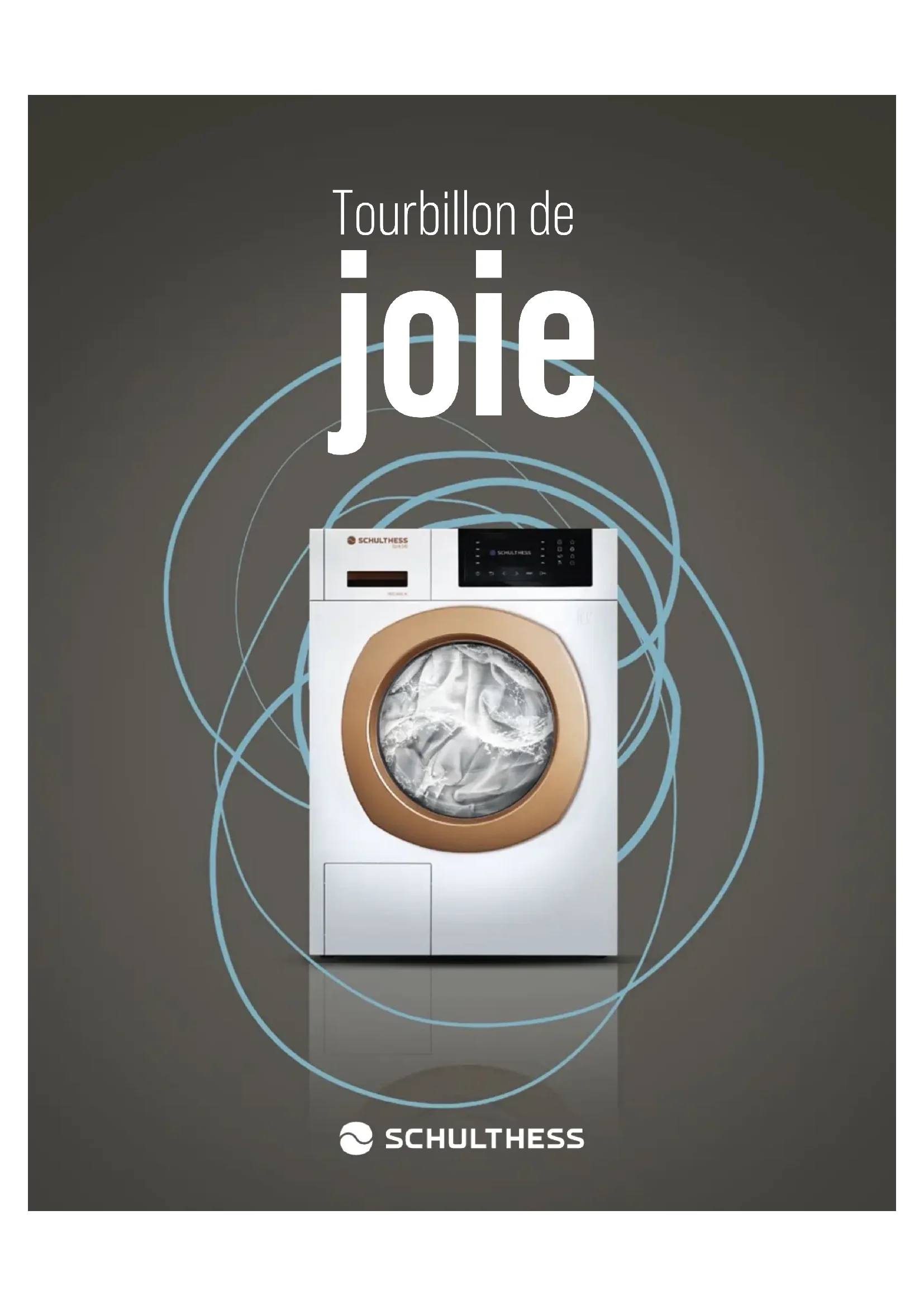 joie Tourbillon deLave comme un pro. Thomas Marder – CEO Schulthess est le groupe d’entreprises suisse leader de la technique de lavage depuis 1845. Schulthess est symbole d’innovation en matière d’entretien du linge. En vraie pionnière, l’entreprise ouvre de nouvelles voies pour simplifier la vie de ses clients. Elle développe et produit en Suisse des machines, instal- lations et solutions systèmes de première qualité pour les particuliers, les petites et moyennes entreprises et l’industrie. Les ventes en Suisse et dans le monde sont complétées de prestations de service professionnelles. Nos produits se distinguent par leur niveau élevé de fonc- tionnalité, de performance, de longue durée de vie, de robustesse et de simplicité d’utilisation. Notre système de paiement numérique washMaster unique en son genre aide vos clients propriétaires d’immeubles collec- tifs à gérer leurs buanderies de manière efficace. Chez Schulthess, nous misons sur la responsabilité indivi- duelle, l’amélioration continue, la confiance mutuelle et le développement personnel. Nous travaillons en équipes performantes, dans un climat d’excellence digne d’une entreprise d’envergure mondiale. La gestion économique et écologique des ressources et l’orientation conséquente sur le développement durable sont notre exigence et constituent la base de notre position solide sur le marché. Nous générons ainsi une plus-value pour nos clients. Chez Schulthess, nous sommes heureux de faire du lavage une expérience plaisante! P 02Notre origine est notre avenir P 0301 Valeurs Schulthess Swiss made 08–09 Design 10–11 Technique intelligente 12–13 Durabilité 14–15 Programmes 16–23