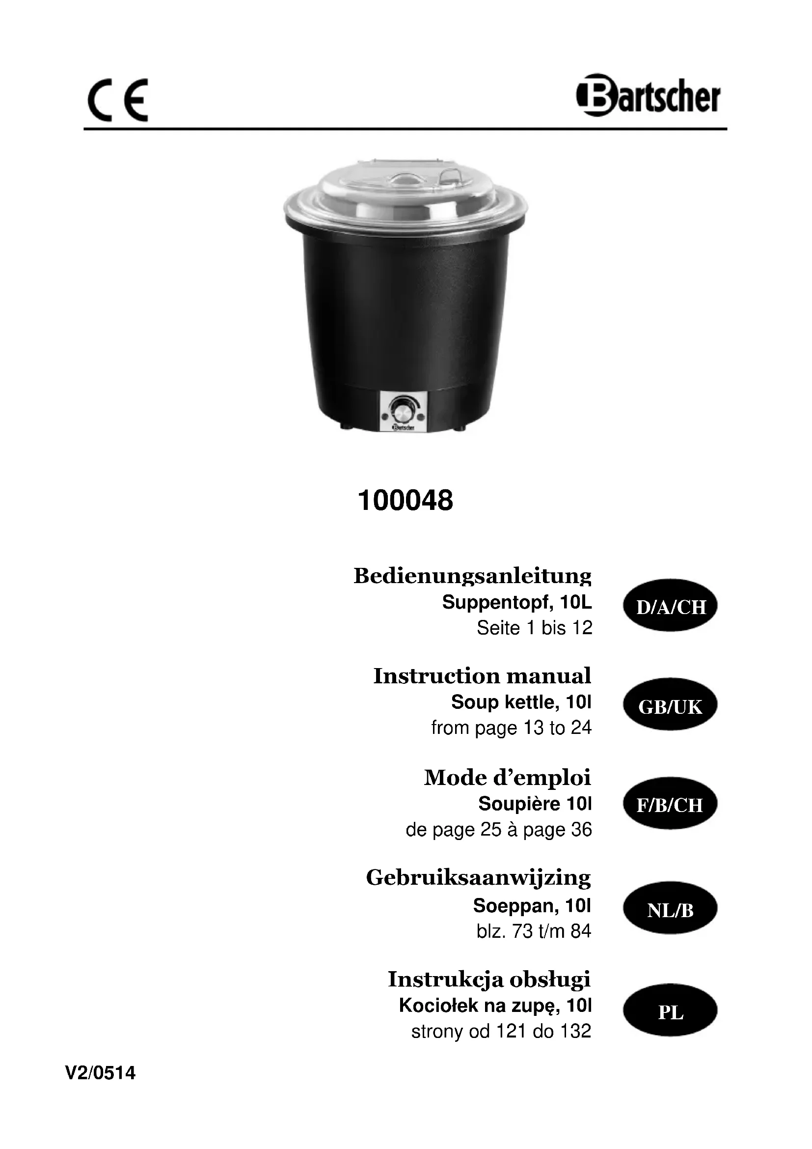 Téléchargez la notice de votre Appareil à soupe au format PDF gratuitement ! Retrouvez votre notice 100048 - BARTSCHER et reprennez votre appareil électronique en main. Sur cette page sont publiés tous les documents nécessaires à l'utilisation de votre appareil 100048 de la marque BARTSCHER.