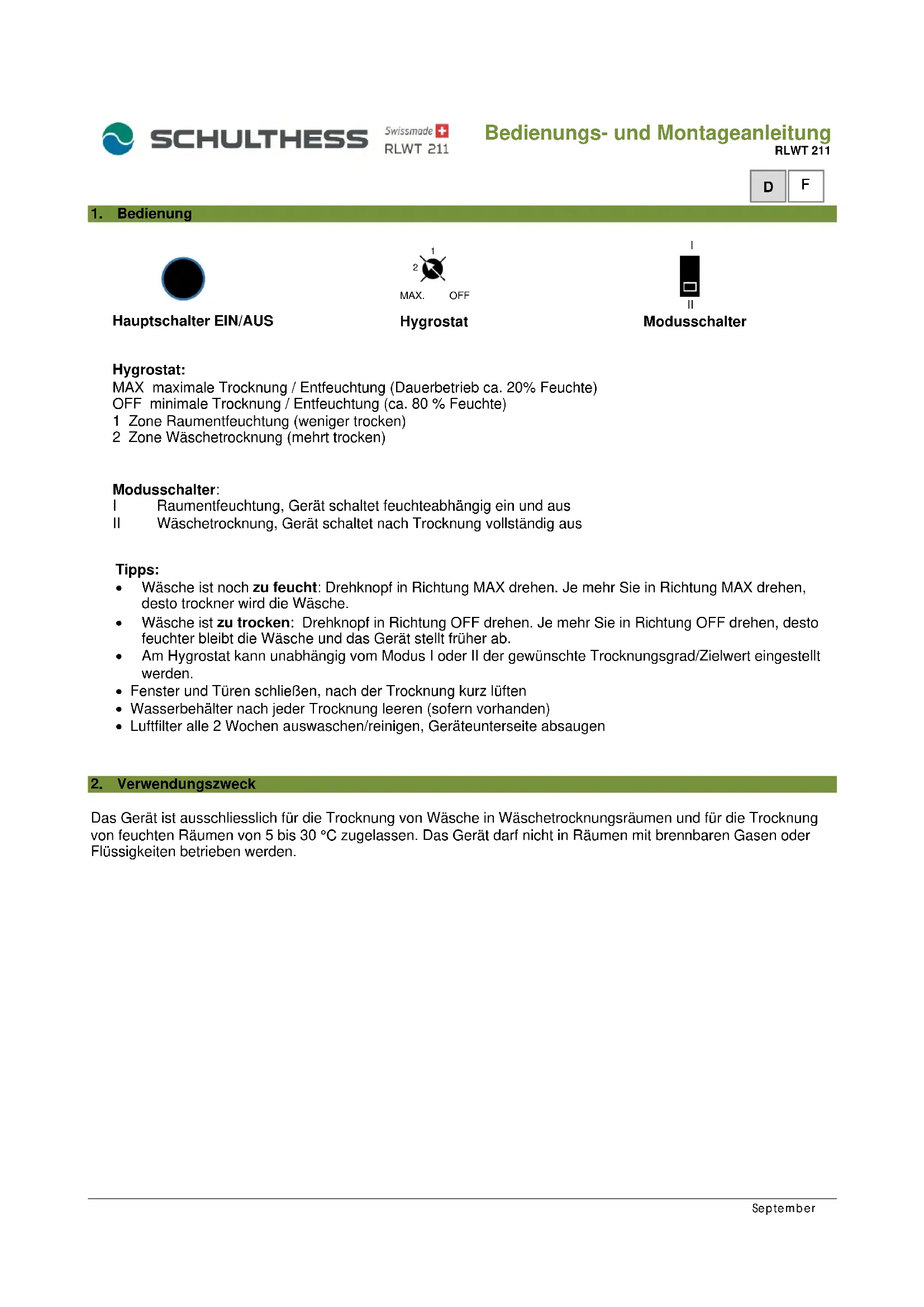 Retrouvez gratuitement la notice de l'appareil Ventus 211 Schulthess au format PDF.