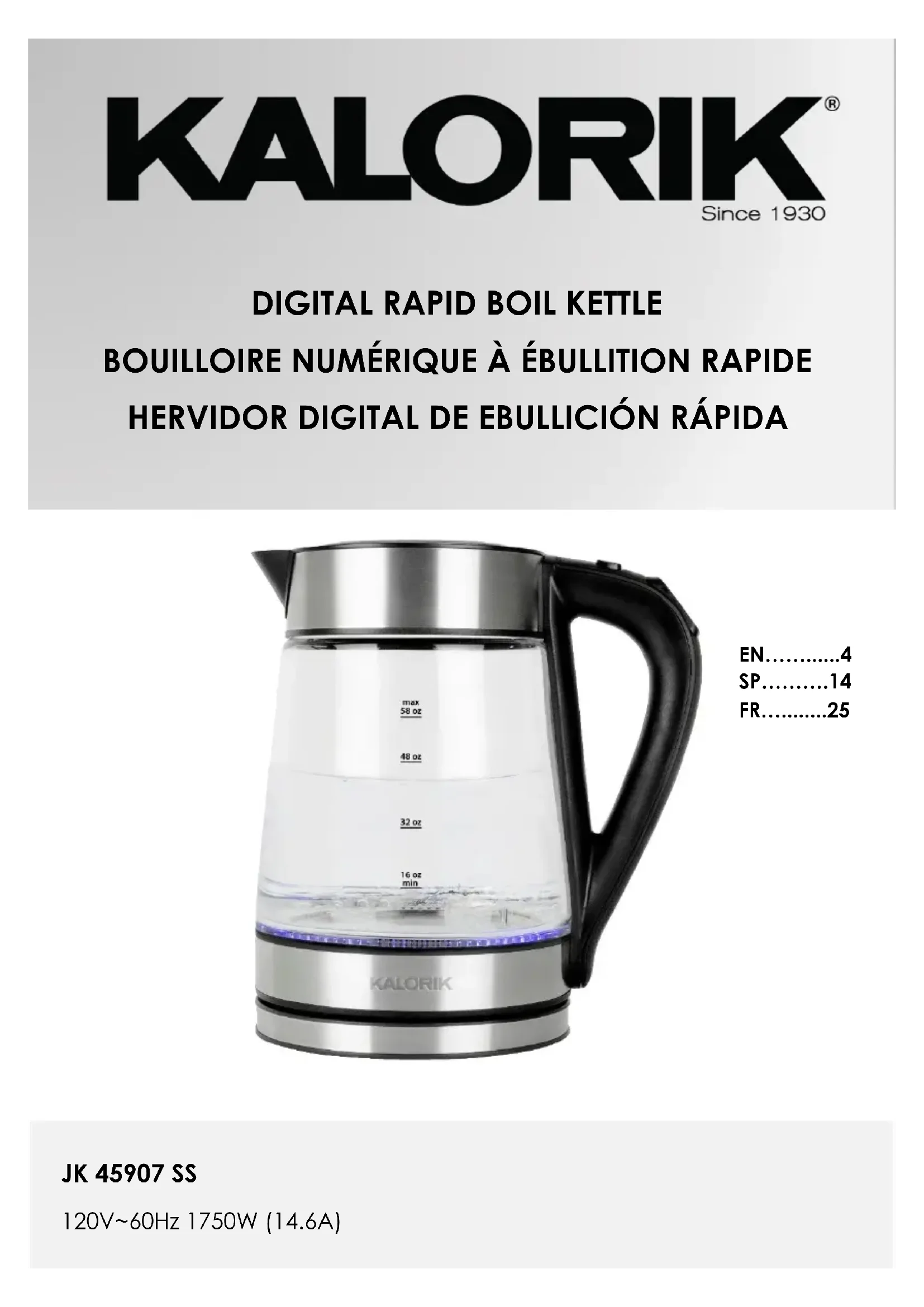 JK 45907 SS - Bouilloire KALORIK - Notice d'utilisation et mode d'emploi gratuit