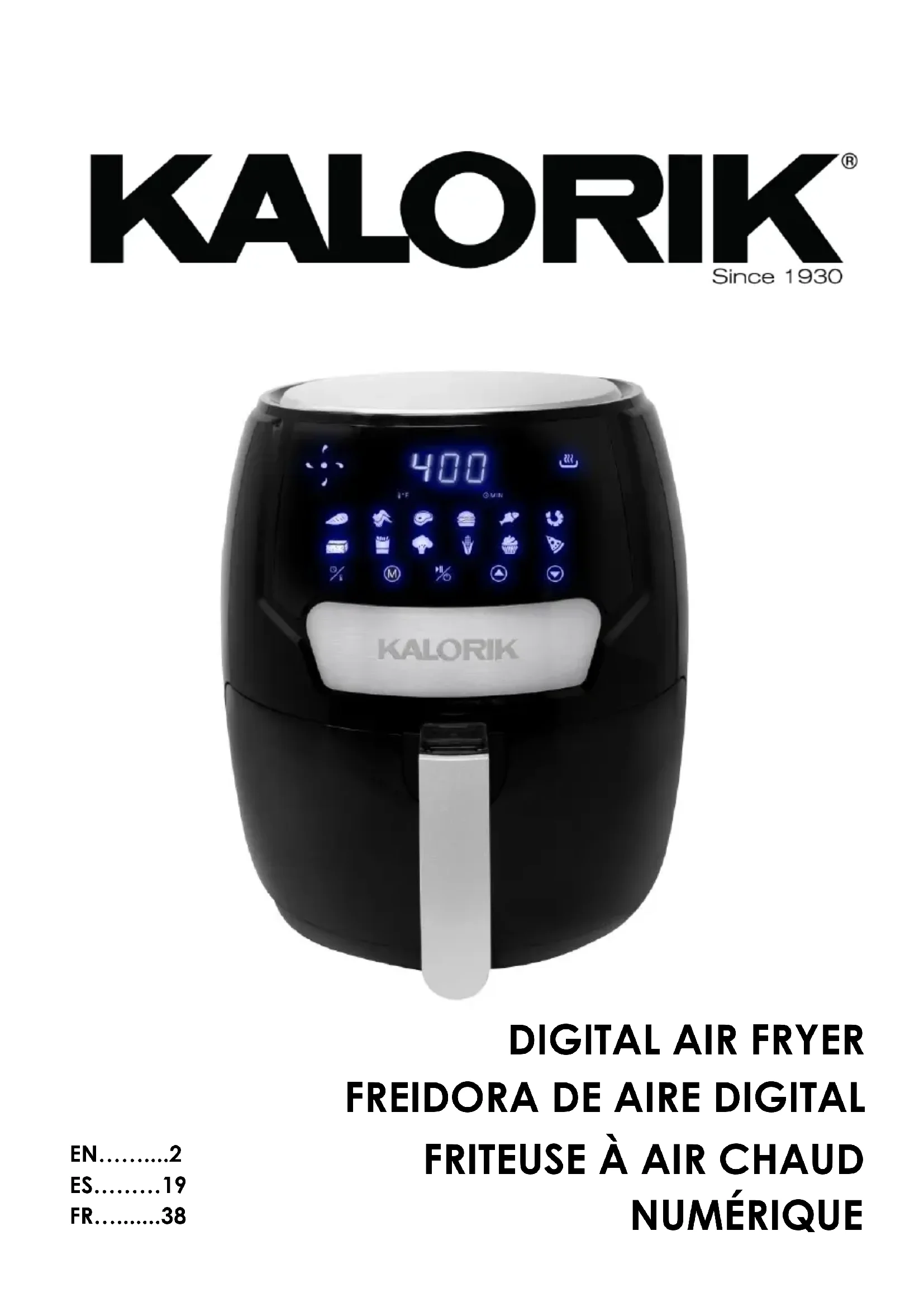 www.KALORIK.com GARANTIE Nous vous suggérons de remplir et de nous renvoyer rapidement la Carte d’Enregistrement Produit ci-jointe afin de faciliter la vérification de la date d’achat. Cependant, le renvoi de la Carte d’Enregistrement Produit n’est pas une condition indispensable à l’application de la présente garantie. Vous pouvez aussi remplir cette carte de garantie en ligne à l’adresse suivante : www.KALORIK.com. À compter de la date d’achat, ce produit KALORIK est garanti un an, sur le territoire des Etats-Unis et au Canada, contre les défauts matériels et de fabrication. Cette garantie n’est pas transférable. Conservez la preuve d’achat originelle. Une preuve d’achat est exigée pour obtenir l’application de la garantie. Durant cette période, le produit KALORIK qui, après inspection par KALORIK, s’avère défectueux, sera réparé ou remplacé, au choix de KALORIK, sans frais pour le consommateur. Si un produit de remplacement est envoyé, c’est la garantie restante du produit originel qui s’appliquera. La présente garantie ne s’applique pas aux défauts dus à une mauvaise utilisation de la part de l’acheteur ou de l’utilisateur, à une négligence, au non-respect des consignes du manuel d’utilisation KALORIK, à une utilisation sur un circuit électrique au voltage différent de celui renseigné sur le produit, à une usure normale, à des modifications ou réparations non autorisées par KALORIK, ou par un usage à des fins commerciales. Il n’existe pas de garantie pour les parties en verre, récipients en verre, filtres, paniers et lames. Il n’existe également pas de garantie pour les pièces perdues par l’utilisateur. Toute garantie de valeur commerciale ou d’adaptabilité à ce produit est également limitée à la garantie d’un an. Certains états ne limitent pas la longueur de la garantie tacite ou n’autorisent pas l’exclusion de dommages-intérêts accessoires ou indirects, les restrictions ci-dessus peuvent donc ne pas s’appliquer à vous. Cette garantie vous donne des droits légaux particuliers, et certains droits peuvent varier d’un état à l’autre.FT 50533 BK – 210602