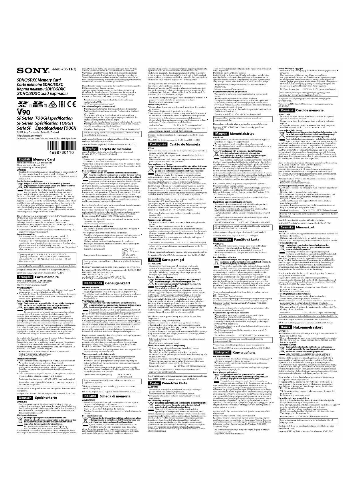 SF-G Tough SDHC - Mémoire Flash SONY - Notice d'utilisation et mode d'emploi gratuit