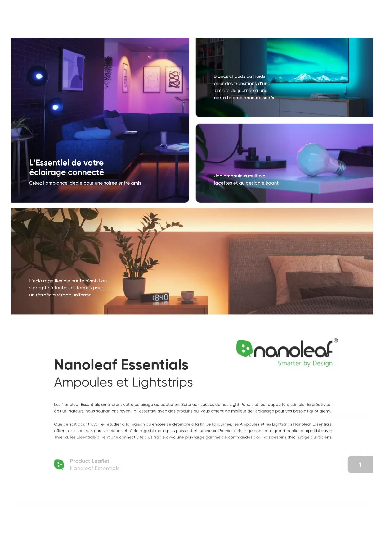 Product Leaflet Nanoleaf Essentials Les Nanoleaf Essentials améliorent votre éclairage au quotidien. Suite aux succès de nos Light Panels et leur capacité à stimuler la créativité des utilisateurs, nous souhaitions revenir à l’essentiel avec des produits qui vous orent de meilleur de l’éclairage pour vos besoins quotidiens. Que ce soit pour travailler, étudier à la maison ou encore se détendre à la fin de la journée, les Ampoules et les Lightstrips Nanoleaf Essentials orent des couleurs pures et riches et l’éclairage blanc le plus puissant et lumineux. Premier éclairage connecté grand public compatible avec Thread, les Essentials orent une connectivité plus fiable avec une plus large gamme de commandes pour vos besoins d’éclairage quotidiens. Nanoleaf Essentials Ampoules et Lightstrips Blancs chauds ou froids pour des transitions d’une lumière de journée à une parfaite ambiance de soirée L’Essentiel de votre éclairage connecté Créez l’ambiance idéale pour une soirée entre amisL’éclairage flexible haute résolution s’adapte à toutes les formes pour un rétroéclairérage uniformeUne ampoule à multiple facettes et au design élégant2 Product Leaflet Nanoleaf Essentials Éclairage Circadien Ajuste automatiquement la température de la couleur de votre éclairage au fil de la journée afin d’optimiser la lumière du jour. Blancs vifs et puissants Des blancs puissants et lumineux avec une large gamme de température de couleur allant des ton les plus froids au plus chauds. Horaires personnalisés Réveillez-vous en douceur au rythme du lever du soleil ou créez des programmes personnalisés sur l’application Nanoleaf. Contrôleur Manuel Allumer/éteindre, changer le degré de luminosité ou faire défilier diérentes couleurs (uniquement sur les Nanoleaf Lightstrips). Compatible Thread Faible latence avec une connectivité et une fiabilité améliorée. Requiert un routeur frontal compatible (ex. HomePod mini). Aucun Hub requis Contrôle simplifié sans aucun hub ou pont de connexion nécéssaires. Couleurs riches Plus de 16M de couleurs, avec une variété de tons riches pour illuminer vos pièces.3 Product Leaflet Nanoleaf Shapes – Triangles