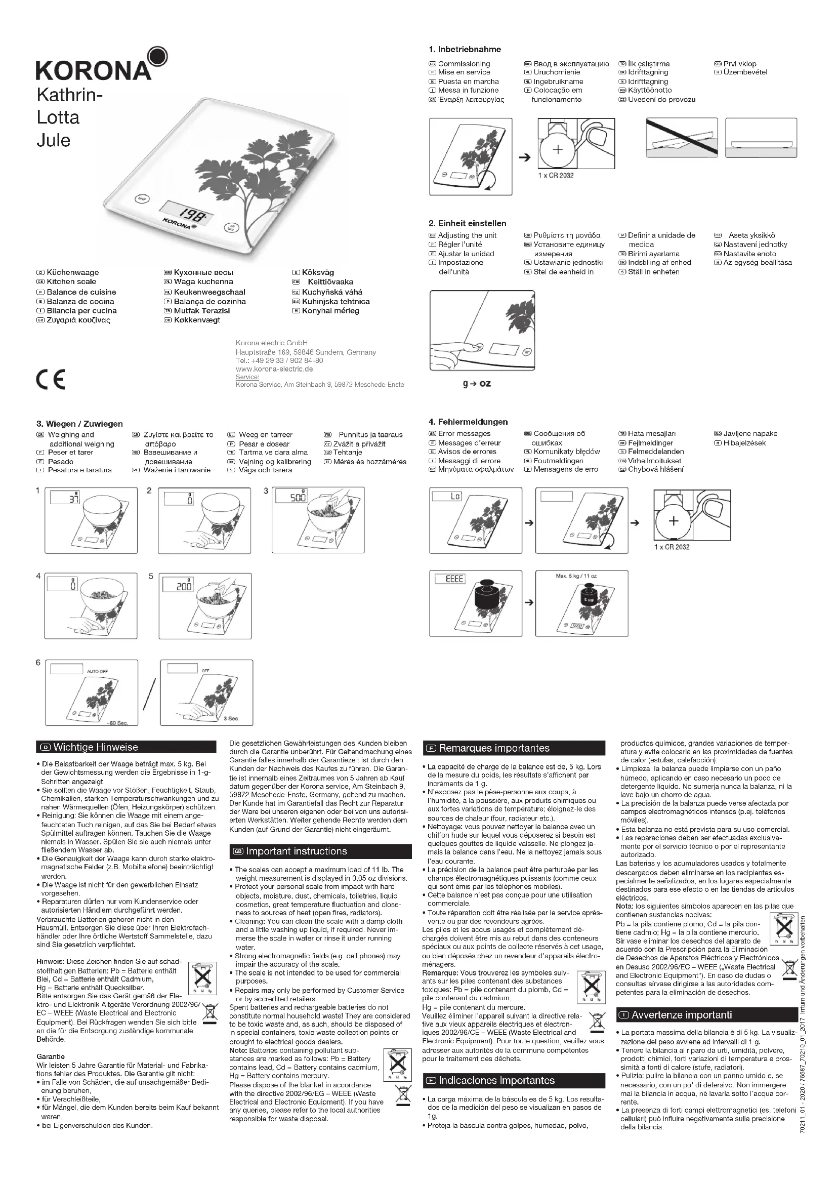 - La capacité de charge de la balance est de, 5 kg. Lorsde la mesure du poids, les résultats s’achent parincréments de 1 g.• N’exposez pas le pèse-personne aux coups, àl’humidité, à la poussière, aux produits chimiques ouaux fortes variations de température; éloignez-le dessources de chaleur (four, radiateur etc.).• Nettoyage: vous pouvez nettoyer la balance avec unchion hude sur lequel vous déposerez si besoin estquelques gouttes de liquide vaisselle. Ne plongez ja-mais la balance dans l’eau. Ne la nettoyez jamais sousl’eau courante.• La précision de la balance peut être perturbée par leschamps électromagnétiques puissants (comme ceuxqui sont émis par les téléphones mobiles).• Cette balance n’est pas conçue pour une utilisationcommerciale.• Toute réparation doit être réalisée par le service après-vente ou par des revendeurs agréés.Les piles et les accus usagés et complètement dé-chargés doivent être mis au rebut dans des conteneurs spéciaux ou aux points de collecte réservés à cet usage, ou bien déposés chez un revendeur d’appareils électro-ménagers.Remarque: Vous trouverez les symboles suiv-ants sur les piles contenant des substances toxiques: Pb = pile contenant du plomb, Cd = pile contenant du cadmium,Hg = pile contenant du mercure.Veuillez éliminer l’appareil suivant la directive rela-tive aux vieux appareils électriques et électron-iques 2002/96/CE – WEEE (Waste Electrical and Electronic Equipment). Pour toute question, veuillez vous adresser aux autorités de la commune compétentes pour le traitement des déchets. E Indicaciones importantes