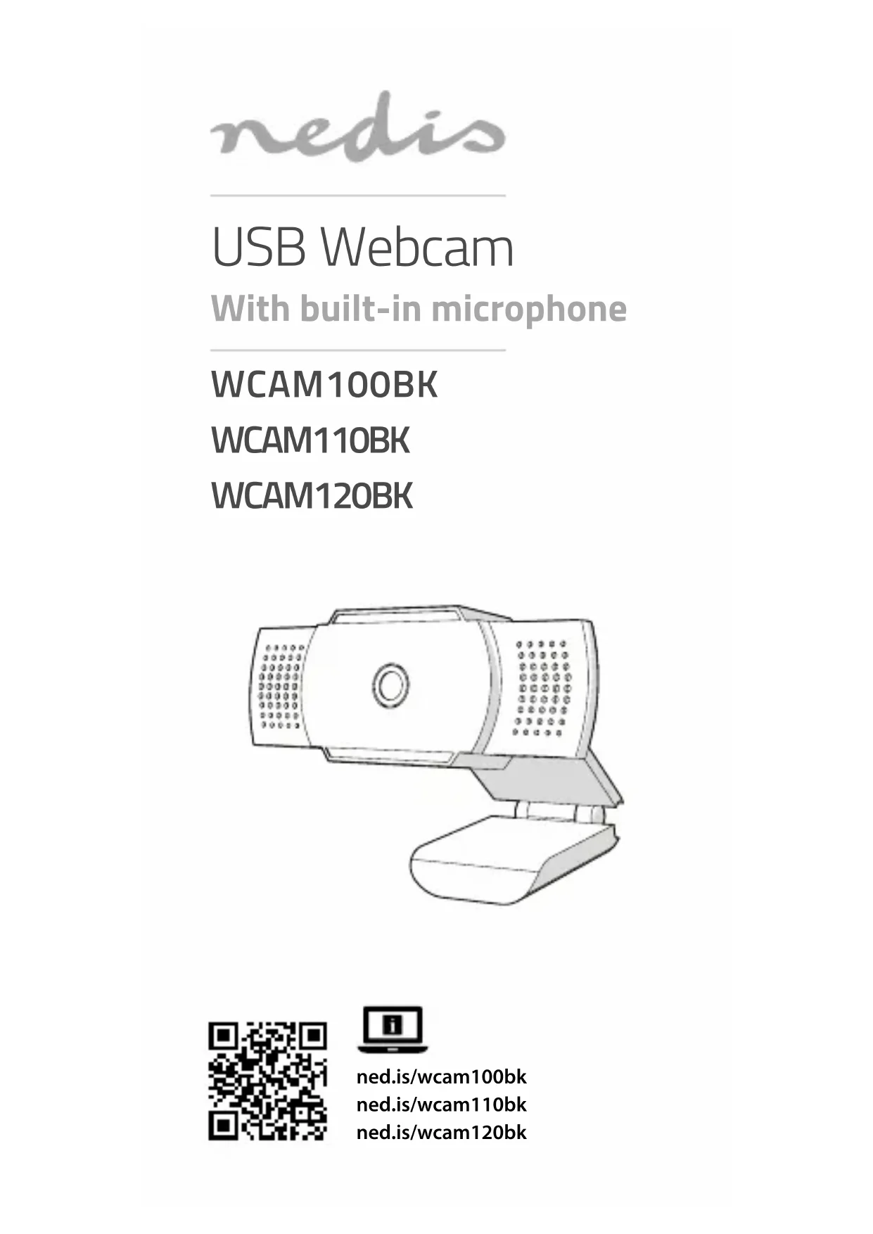 Guide de démarrage rapide Webcam USB WCAM100BK WCAM110BK WCAM120BK Pour plus d'informations, consultez le manuel détaillé en ligne : ned.is/ wcam100bk Pour plus d'informations, consultez le manuel détaillé en ligne : ned.is/ wcam110bk Pour plus d'informations, consultez le manuel détaillé en ligne : ned.is/ wcam120bk10 Utilisation prévue La Nedis WCAM100BK/WCAM110BK/WCAM120BK est une webcam plug-and-play avec un microphone intégré. Le produit est prévu pour un usage intérieur uniquement. Toute modication du produit peut avoir des conséquences sur la sécurité, la garantie et le bon fonctionnement. Le produit est destiné à être utilisé dans des environnements domestiques pour des fonctions de ménage typiques qui peuvent également être réalisées par des utilisateurs non experts pour des fonctions de ménage typiques, tels que : des magasins, bureaux, autres environnements de travail similaires, fermes, par des clients dans des hôtels, motels et autres environnements de type résidentiel et/ou dans des environnements de type chambres d'hôtes. Ce produit peut être utilisé par des enfants âgés de 8 ans et plus ainsi que des personnes ayant des capacités physiques, sensorielles ou mentales réduites ou manquant d’expérience et de connaissances s’ils sont supervisés ou ont reçu des instructions sur l’utilisation du produit en toute sécurité et comprennent les dangers impliqués. Les enfants ne doivent pas jouer avec le produit. Le nettoyage et la maintenance ne doivent pas être eectués par des enfants sans surveillance. Pièces principales (image A) 1 Microphone intégré 2 Webcam 3 Support de montage 4 Câble USB L’apparence peut diérer en fonction du modèle.11 Consignes de sécurité