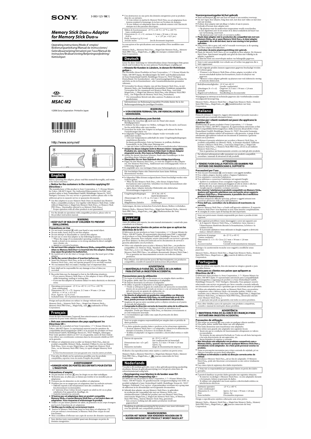 Memory Stick PRO Duo , MagicGate and are trademarks of Sony Corporation.Avant de faire fonctionner l’appareil, lisez attentivement ce mode d’emploi et conservez-le pour toute référence ultérieure. < Avis aux consommateurs des pays appliquant les Directives UE > Le fabricant de ce produit est Sony Corporation, 1-7-1 Konan Minato-ku Tokyo, 108-0075 Japon. Le représentant autorisé pour les questions de compatibilité électromagnétique (EMC) et la sécurité des produits est Sony Deutschland GmbH, Hedelnger Strasse 61, 70327 Stuttgart, Allemagne. Pour toute question relative au SAV ou à la garantie, merci de bien vouloir vous référer aux coordonnées contenues dans les documents relatifs au SAV ou la garantie.