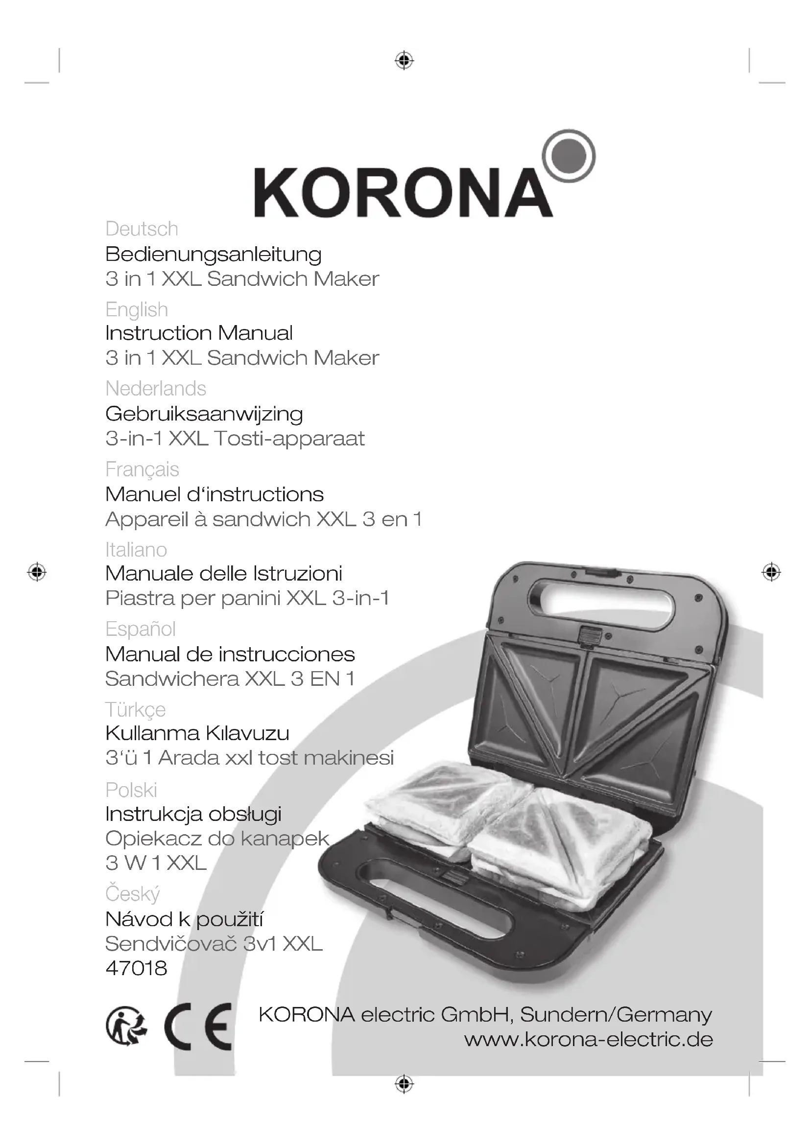 - pour les dommages causés par le propriétaire Cette garantie n’affecte pas votre droit légal, ni aucun droit légal que vous pourriez avoir en tant que client en vertu de la législation nationale applicable régissant l’achat de biens. Pour faire valoir son droit de garantie pendant la période de garantie, le client doit fournir la preuve de la date d’achat (reçu). La garantie doit être demandé à Ligne téléphonique : +49 2933 90284-80 E-mail : service@korona-electric.de web : www.korona-electric.de Dans les 2 ans suivant la date d’achat. En cas de garantie, le client a le droit de réparer l’appareil avec nous ou dans un magasin autorisé. Les droits supplémentaires (en raison du droit de garantie) ne sont pas donnés au client.42 Destinazione d’Uso Prima dell’uso, leggi attentamente queste istruzioni e conservale in un luogo sicuro per riferimento futuro. Quando si cede l’apparecchio a terzi, assicurati di includere queste istruzioni. Questo apparecchio è concepito e adatto per tostare panini, preparare waffle e grigliare. Qualsiasi altro utilizzo o modifica dell’apparecchio non è autorizzato dal produttore e potrebbe comportare il rischio di danni o lesioni. Questo apparecchio non è destinato ad un uso commerciale! Sicurezza: Questo simbolo avverte l’utente del rischio di infortuni! Questo simbolo segnala la presenza di parti roventi. Rischio di ustioni! Questo simbolo avverte l’utente del rischio di folgorazioni! Avvertenze Generali