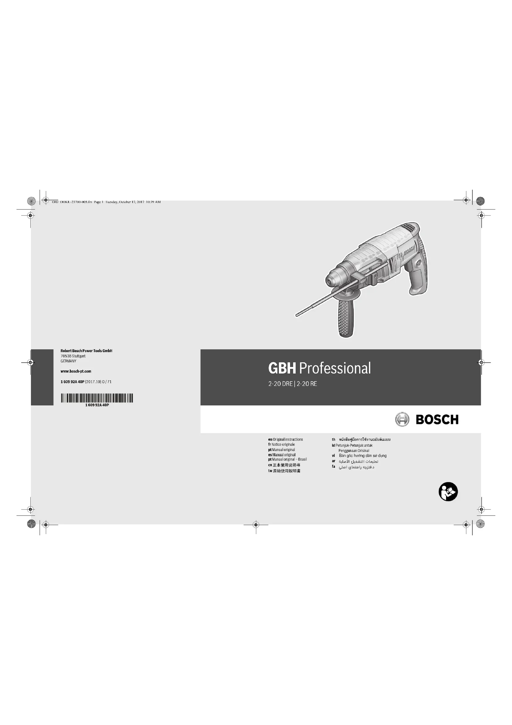 Retrouvez gratuitement la notice de l'appareil GBH 2-20 RE Professional BOSCH au format PDF.