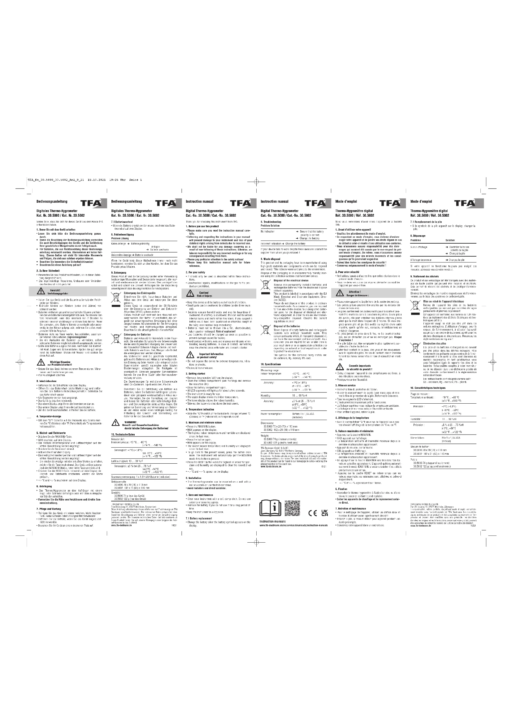 - Setzen Sie das Gerät keinen extremen Temperaturen, Vibra-tionen und Erschütterungen aus. • Vor Feuchtigkeit schützen.3. Inbetriebnahme• Entfernen Sie die Schutzfolie von dem Display. • Öffnen Sie das Batteriefach (siehe Markierung) und entfer-nen Sie den Batterieunterbrechungsstreifen. Schließen Siedas Batteriefach wieder • Alle Segmente werden kurz angezeigt.• Das Gerät ist jetzt betriebsbereit.• Das obere Display zeigt Ihnen die Innentemperatur an.• Das untere Display zeigt Ihnen die Luftfeuchtigkeit an.• Um das Gerät auszuschalten, entfernen Sie die Batterie.4. Temperatur-Anzeige• Mit dem °C/°F Schalter auf der Rückseite des Gerätes kön-nen Sie °C (Celsius) oder °F (Fahrenheit) als Temperaturein-heit auswählen.5. Höchst- und Tiefstwerte• Drücken Sie die MAX/MIN-Taste.• MAX erscheint auf dem Display.• Die höchste Innentemperatur und Luftfeuchtigkeit seit derletzten Rückstellung werden angezeigt.• Drücken Sie die Taste noch einmal.• MIN erscheint auf dem Display.• Die niedrigste Innentemperatur und Luftfeuchtigkeit seit derletzten Rückstellung werden angezeigt. Um wieder die Anzeige mit den aktuellen Werten zu erhalten,drücken Sie die Taste noch einmal. Das Gerät verlässt automa-tisch den MAX/MIN-Modus, wenn keine Taste gedrückt wird.• Drücken Sie die RESET-Taste, während auf dem Display dieHöchst- und Tiefstwerte erscheinen, werden die Wertegelöscht. • --.- °C und --.- % erscheinen auf dem Display. 6. Anbringung• Das Thermo/Hygrometer an dem Aufhänger mit einemNagel oder Schraube befestigen oder mit dem ausklappba-ren Ständer aufstellen. • Vermeiden Sie die Nähe von Heizkörpern und direkte Son-neneinstrahlung.7. Pflege und Wartung• Reinigen Sie das Gerät mit einem weichen, leicht feuchtenTuch. Keine Scheuer- oder Lösungsmittel verwenden!• Entfernen Sie die Batterie, wenn Sie das Gerät längere Zeitnicht verwenden.• Bewahren Sie Ihr Gerät an einem trockenen Platz auf. Bedienungsanleitung Digitales Thermo-Hygrometer Kat. Nr. 30.5000 / Kat. Nr. 30.5002 Bedienungsanleitung Digitales Thermo-Hygrometer Kat. Nr. 30.5000 / Kat. Nr. 30.5002 7.1 Remplacement de la pile• Si le symbole de la pile apparaît sur le display, changer lapile. 8. DépannageProblème SolutionAucun affichage ➜ Contrôlez la bonne polarité de la pile ➜ Changez la pileAffichage incorrecte ➜ Changez la pileSi votre appareil ne fonctionne toujours pas malgré cesmesures, adressez-vous à votre vendeur.9. Traitement des déchetsCe produit et son emballage ont été fabriqués avec des matéri-aux de haute qualité qui peuvent être recyclés et réutilisés. Cela permet de réduire les déchets et de protéger l’environ-nement.Éliminez les emballages de manière respectueuse de l'environ-nement par le biais des systèmes de collecte établis.Mise au rebut de l'appareil électriqueRetirez de l'appareil les piles et les batteriesrechargeables qui ne sont pas installées de façonpermanente et jetez-les séparément.Cet appareil est conforme aux normes de l'UE rela-tives au traitement des déchets électriques et élec-troniques (WEEE). L'appareil usagé ne doit pas être jeté dans lesordures ménagères. L’utilisateur s’engage, pour lerespect de l’environnement, à déposer l’appareilusagé dans un centre de traitement agréé pour lesdéchets électriques et électroniques. Respectez lesréglementations en vigueur !Élimination des pilesLes piles et les batteries rechargeables ne doiventpas être jetées dans les détritus ménagers. Ellescontiennent des polluants qui peuvent nuire à l'envi-ronnement et à la santé si elles sont éliminées demanière inappropriée. En tant qu'utilisateur, vousavez l'obligation légale de rapporter les piles et lesbatteries rechargeables usagées à votre revendeurou de les déposer dans une déchetterie proche devotre domicile conformément à la réglementationnationale et locale.Les métaux lourds sont désignés comme suit : Cd = cadmium, Hg = mercure, Pb = plomb. 10. Caractéristiques techniquesPlage de mesure :Température ambiante : -10 °C… +60 °C (+14 °F…+140 °F) Précision : ±1°C (±1,8°F) à -10°C…+50°C (+14 °F…+122 °F)Humidité : 10 … 99 %rHPrécision : ±5 % à 25 …75 %rH à 0°C...+50°C (+32 °F …+122 °F)Alimentation : Pile 1 x 1,5V AAA (incluse)Mesure de boîtier :30.5000 70 x 20 (70) x 110 mm30.5002 102 x 21 (50) x 110 mmPoid s:30.5000 74 g (appareil seulement)30.5002 122 g (appareil seulement)TFA Dostmann GmbH & Co.KGZum Ottersberg 12, 97877 Wertheim, AllemagneLa reproduction, même partielle, du présent mode d'emploi est stricte-ment interdite sans l'accord explicite de TFA Dostmann. Les caractéris-tiques techniques de ce produit ont été actualisées au moment de l'im-pression et peuvent être modifiées sans avis préalable. Les dernièresdonnées techniques et les informations concernant votre produit peuventêtre consultées en entrant le numéro de l'article sur notre site Internet.www.tfa-dostmann.de 10/21Nous vous remercions d'avoir choisi l'appareil de la SociétéTFA. 1. Avant d'utiliser votre appareil• Veuillez lire attentivement le mode d'emploi. • En respectant ce mode d'emploi, vous éviterez d'endom-mager votre appareil et de perdre vos droits légaux en casde défaut si celui-ci résulte d’une utilisation non-conforme. • Nous n'assumons aucune responsabilité pour des dom-mages qui auraient été causés par le non-respect du pré-sent mode d'emploi. De même, nous n’assumons aucuneresponsabilité pour des relevés incorrects et les consé-quences qu’ils pourraient engendrer.• Suivez bien toutes les consignes de sécurité !• Conservez soigneusement le mode d'emploi !2. Pour votre sécurité• Ne l'utilisez jamais à d'autres fins que celles décrites dans leprésent mode d'emploi. • Vous ne devez en aucun cas réparer, démonter ou modifierl'appareil par vous-même.Attention ! Danger de blessure :