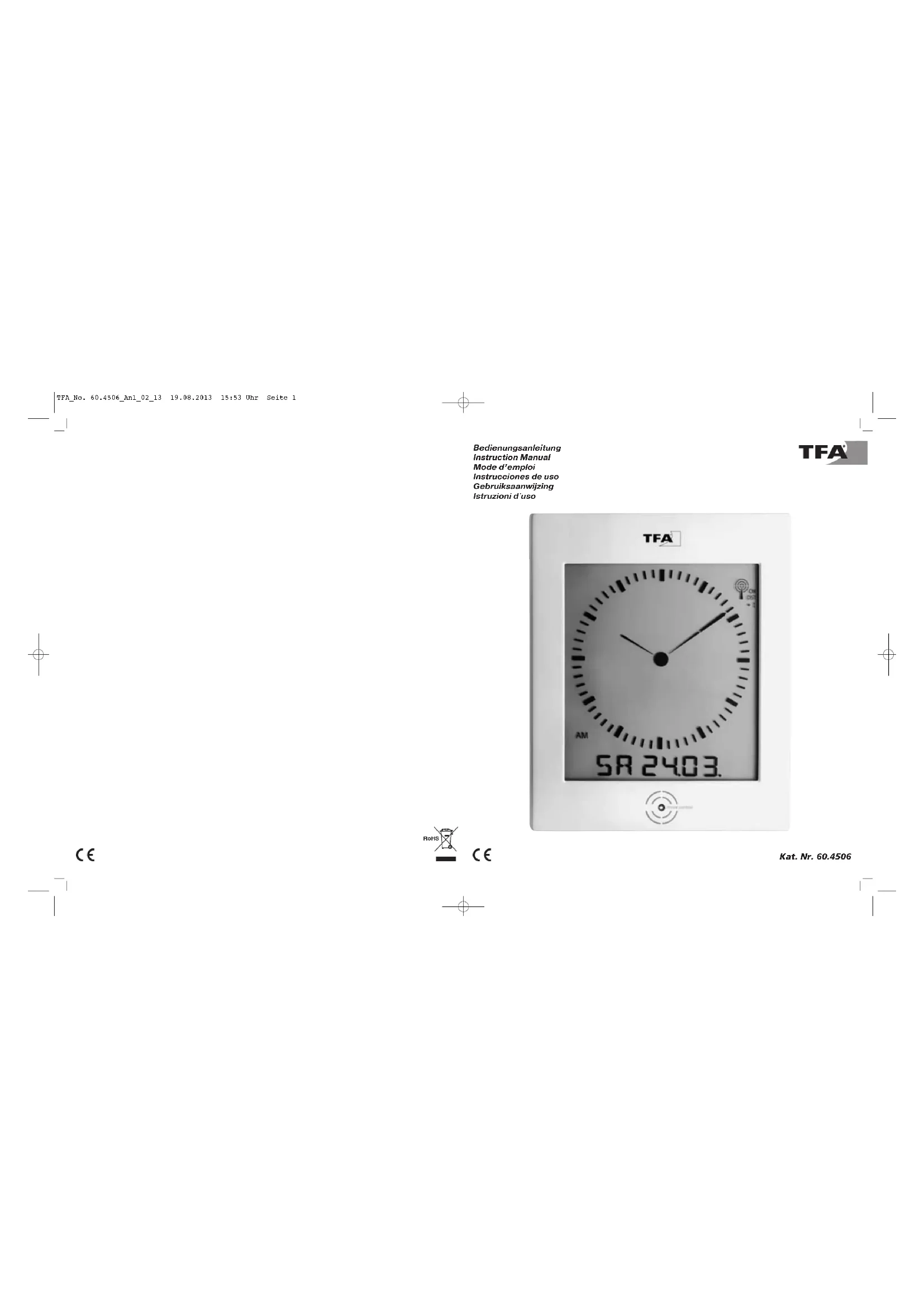 Nous déclarons que cet appareil émetteur récepteur d'ondes radio répond aux exigences essentielles de la directive R&TTE 1999/5/CE. Une copie signée et datée de la déclaration de conformité est disponible sur demande auprès de info@tfa-dostmann.de.www.tfa-dostmann.de 02/13 TFA_No. 60.4506_Anl_02_13 19.08.2013 15:53 Uhr Seite 10Orologio a muro radiocontrollato con clima ambientale