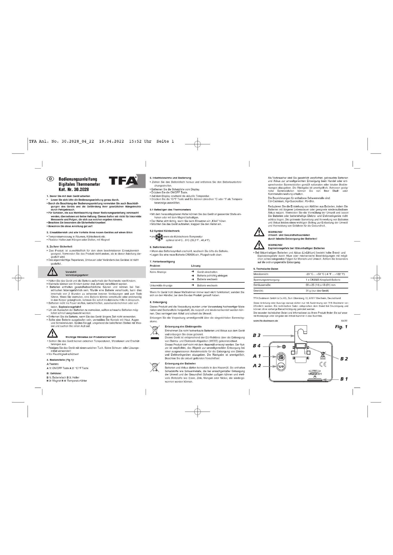 - Note:The holder is inserted properly when you hear a “click”.• For table standing please fold in the holder.5.2 Symbol for refrigerator • appears, if the refrigerator temperature is optimal4°C…8°C (39.2°F…46.4°F).6. Battery replacement• When the battery symbol appears, replace the battery.• Pull out the battery compartment.• Insert a new battery CR 2025, + pole upwards.7. TroubleshootingProblems SolutionNo display Switch on the instrument Ensure battery polarity is correct Change the batteryIncorrect display Change the batteryIf your device fails to work despite these measures contact the supplier from whomyou purchased it.8.Waste disposalThis product and its packaging have been manufactured using high-grade materialsand components which can be recycled and reused. This reduces waste and pro-tects the environment.Dispose of the packaging in an environmentally friendly manner using the collectionsystems that have been set up.Disposal of the electrical deviceRemove non-permanently installed batteries and rechargeable batter-ies from the device and dispose of them separately.This product is labelled in accordance with the EU Waste Electricaland Electronic Equipment Directive (WEEE).This product must not be disposed of in ordinary household waste. Asa consumer, you are required to take end-of-life devices to a designat-ed collection point for the disposal of electrical and electronic equip-ment, in order to ensure environmentally-compatible disposal. Thereturn service is free of charge. Observe the current regulations inplace!Disposal of the batteries Batteries and rechargeable batteries must never be disposed of withhousehold waste.They contain pollutants such as heavy metals, whichcan be harmful to the environment and human health if disposed ofimproperly, and valuable raw materials such as iron, zinc, manganeseor nickel that can be recovered from waste.As a consumer, you are legally obliged to hand in used batteries andrechargeable batteries for environmentally friendly disposal at retailersor appropriate collection points in accordance with national or localregulations. The return service is free of charge. You can obtainaddresses of suitable collection points from your city council or localauthority.The names for the heavy metals contained are:Cd=cadmium, Hg=mercury, Pb=lead.Reduce the generation of waste from batteries by using batteries witha longer lifespan or suitable rechargeable batteries. Avoid littering theenvironment and do not leave batteries or battery-containing electricaland electronic devices lying around carelessly. The separate collectionand recycling of batteries and rechargeable batteries make an impor-tant contribution to relieving the impact on the environment and avoid-ing health risks.WARNING! Damage to the environment and health through incorrect disposal of the batteries!WARNING! Batteries containing lithium can explode• Batteries and rechargeable batteries containing lithium (Li=lithium) present ahigh risk of fire and explosion due to heat or mechanical damage with potential-ly serious consequences for people and the environment. Pay particular atten-tion to correct disposal.9. SpecificationsMeasuring range: -20 °C… +50 °C (-4 °F …+122 °F)Power consumption: 1 x CR2025 Button cell batteryHousing dimensions: 68 x 25 (14) x 43 (61) mmWeight: 31 g (device only)TFA Dostmann GmbH & Co.KG, Zum Ottersberg 12, 97877 Wertheim, GermanyNo part of this manual may be reproduced without written consent of TFA Dostmann. Thetechnical data are correct at the time of going to print and may change without prior notice.The latest technical data and information about this product can be found in our homepageby simply entering the product number in the search box.www.tfa-dostmann.de 04/22 Instruction manuals www.tfa-dostmann.de/en/service/downloads/instruction-manuals TFA Anl. No. 30.2028_04_22 19.04.2022 15:52 Uhr Seite 2 Mode d'emploi Thermomètre numérique Réf. 30.2028