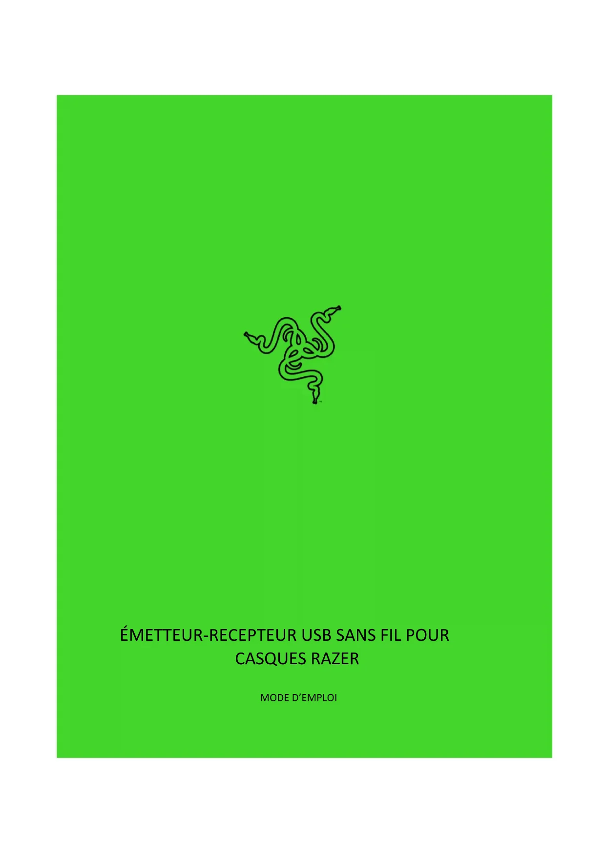 INFORMATIONS SUR LES DROITS D’AUTEUR ET DROITS DE PROPRIÉTÉ INTELLECTUELLE ©2025 Razer Inc. Tous droits réservés. Razer, le logo du serpent à trois têtes, le logo Razer, « For Gamers. By Gamers. » et le logo « Razer Chroma » sont des marques commerciales, des marques déposées de Razer Inc. ou des sociétés affiliées aux États-Unis et dans d’autres pays. Toutes les autres marques commerciales sont la propriété de leurs propriétaires respectifs. Razer Inc. (« Razer ») peut avoir des droits d’auteur, des marques commerciales, des secrets de fabrication, des brevets, des demandes de brevet, ou d’autres droits de propriété intellectuelle (enregistrés ou non enregistrés) concernant le produit dans ce guide. Ce guide ne vous donne pas de licence pour ce droit d’auteur, cette marque commerciale, ce brevet ou tout autre droit de propriété intellectuelle. L’émetteur-récepteur USB sans fil pour casques Razer (le « Produit ») peut différer des images, que ce soit sur l’emballage ou autrement. Razer n’assume aucune responsabilité pour de telles différences ou pour toute erreur pouvant apparaître. Les informations contenues dans ce document sont susceptibles d’être modifiées sans préavis.