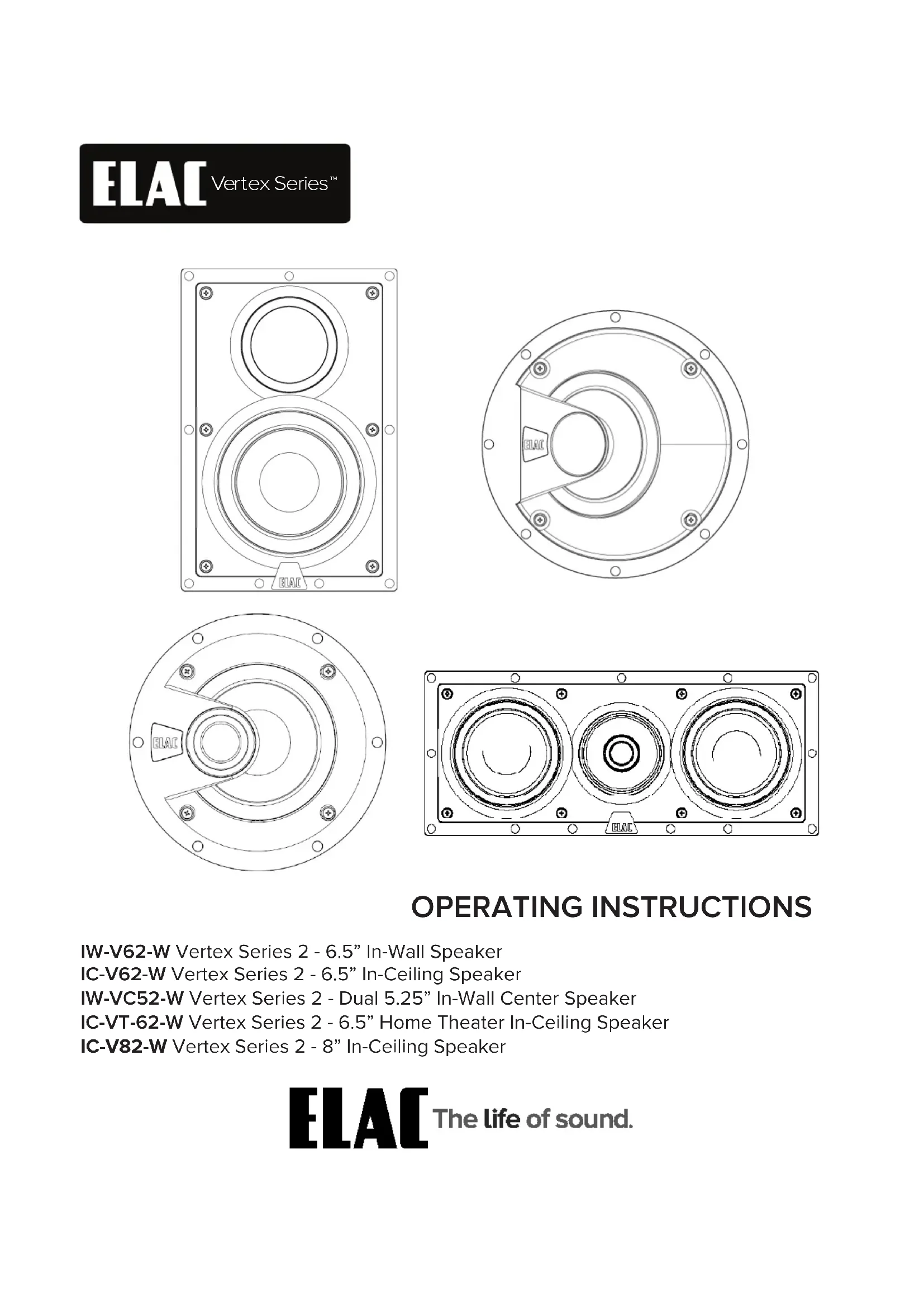 Vertex SeriesINTRODUCTION Merci d’avoir acheté ces excellents haut-parleurs et bienvenue dans la famille ELAC. Depuis notre fondation, en 1926, nous nous sommes eorcés de créer les meilleurs produits du marché. Notre équipe passionnée est toujours en quête de solutions pour le plus grand plaisir de votre écoute. Nous vous remercions d’avoir fait ce choix. Ces haut-parleurs encastrables de série Vertex 2 ELAC sont conçus pour reproduire fidèlement la gamme complète de la musique et du cinéma sans occuper d’espace au sol. Ce format compact est idéal là où les haut- parleurs traditionnels sont incommodes ou carrément impossibles. Les haut-parleurs encastrables sont idéaux pour profiter pleinement du son Surround, pour les espaces exiguës ou pour transporter la musique dans les autres pièces de la maison. Avant de commencer, veuillez prendre quelques minutes pour lire attentivement ce manuel. En outre, veillez à garder ce manuel dans un endroit sûr afin de pouvoir vous y référer au besoin. Les informations contenues dans ce manuel s’appliquent à ces quatre modèles ELAC IW-V62-W Haut-parleur encastrable 6,5 po. série Vertex 2 Avec sa reproduction extrêmement précise de la totalité de la gamme de fréquence, ce haut-parleur convient parfaitement au cinéma maison et à la musique. IC-V62-W Haut-parleur de plafond 6,5 po. de la série Vertex 2 Ce haut-parleur est parfait pour être installé dans les plafonds et fournit le même rendu sonore exceptionnel que son homologue encastrable. IW-VC52-W Haut-parleur central double encastrable 5,25 po. de série Vertex 2 Ce haut-parleur est parfait pour faire une reproduction exceptionnelle du dialogue dans une émission de télévision et de la musique, et il répond aux exigences complexes du canal central dans un système de cinéma maison. IC-VT62-W Haut-parleur de plafond 6,5 po. de série Vertex 2 pour cinéma maison IC-V82-W Haut-parleur de plafond 8 po. de la série Vertex 2 Lors de l’installation, un des principaux défis à surmonter est celui de la directivité étroite des haut-parleurs de graves et d’aigus auquel on tente de remédier en orientant le haut-parleur vers l’auditeur. Certains haut-parleurs fournissent simplement un haut-parleur d’aigus pivotant qui peut être tourné légèrement de façon à ce qu’il « vise » l’auditeur. Une gamme typique ne produit presque aucun changement dans l’équilibre sonore et ne fait rien pour résoudre la directivité du haut-parleur de graves. Le ELAC IC-VT62-W est conçu pour que le haut- parleur de graves et le haut-parleur d’aigus soient montés à un angle de 30 degrés et dirigent mieux le son vers la zone d’écoute.