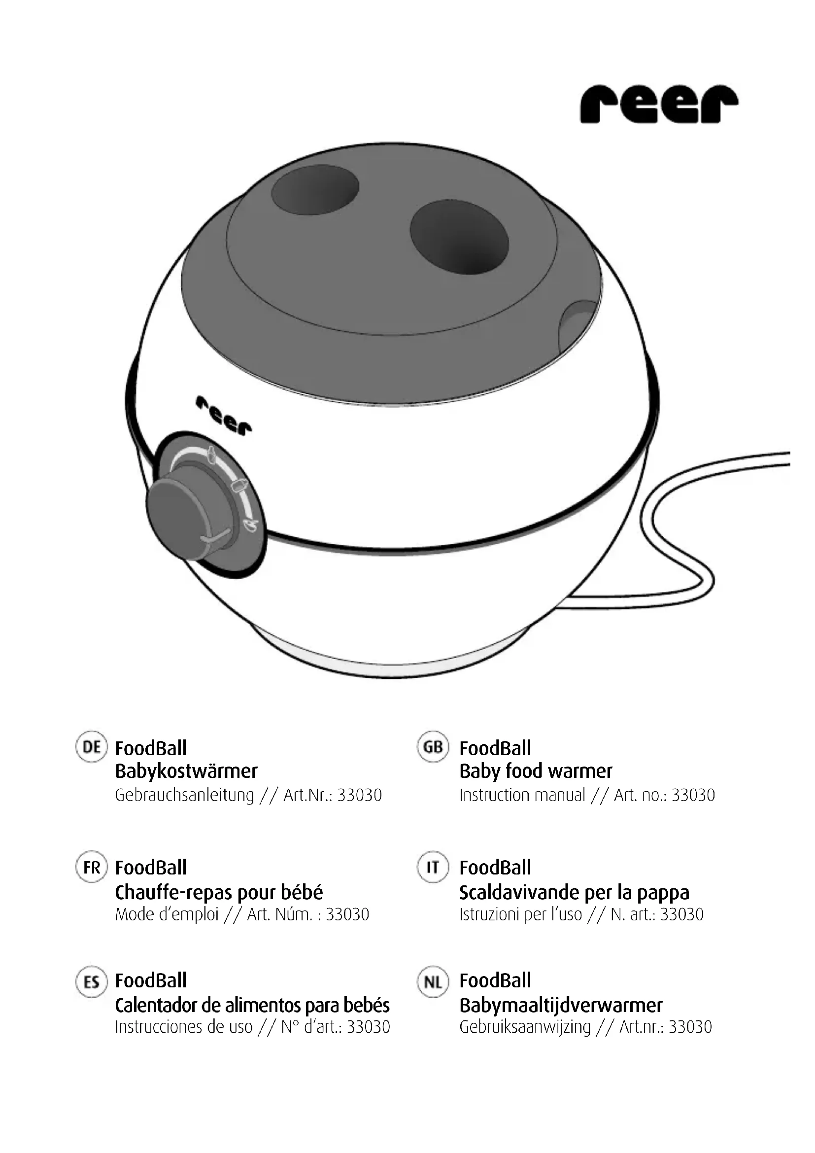 Before warming, remove the label from the food bottle, so that it does not detach during warming and stick to the water container of the baby food warmer. Unscrew the lid of the food bottle before putting it in the device. Place the bottle in the device and fill the water container with warm water until it reaches approximately 1 cm from the edge of the con- tainer. Alternatively, you can use the food container for warming the baby food. Put 90 ml of water in the baby food warmer. To do this, you can use the food cup with an integrated measuring cup. Then put the baby food in the food container (max. 190 g) and place it without the storage lid in the baby food warmer. Caution: Do not use more than 90 ml of water for warming; otherwise, the water will spill over when using the container. Move the rotary switch on the front side to the mark. The oper- ating light is on. We recommend stirring the food occasionally to let the heat distribute evenly. The warming time can be extended or shortened depending on the contents and the amount thereof, on the type of food container used as well as on the initial water temperature and the ambient temperature. The warming time for baby food is about 6–8 minutes, depending on the factors mentioned above, as well as on the initial temperature of the baby food. Remove the glass or food container from the baby food warmer and, as the warming opera- tion is over, turn the rotary switch for temperature setting back to the OFF position. Remove the device’s plug from its power source and pour the water out of the baby food warmer. Caution: Hot! Please let it cool down for some time. Caution: Before you give the baby food to your child, always check the temperature of its contents first. The baby food must not be hotter than 37 °C (i.e. body temperature). Thus, always check the temperature. 3.Function for maintaining heat You can also keep already-heated baby food warm: to do this, simply leave the bottle in the device after warming and set the rotary switch in the position for keeping the food warm (see Figure). Caution: For microbiological reasons (germ formation), you should keep baby food warm for no more than 1 hour.18 19 Cleaning Descaling At the end of its life, this product must not be disposed of as normal domestic waste, but should be recycled at a collection point for electrical appliances. Please see the relevant symbol on the product, in the user manual and pack- aging. Materials can be recycled as specified. An important contribution to the protection of the environment can be made by reusing the unit, re- cycling its components or otherwise reusing old appliances. Please contact your local council to find out more about an appropriate disposal centre. Environmental protection Cleaning the device: Always disconnect it from the mains and ensure that the equipment is cold before cleaning it. Do not submerge the device in water. Do not use any scouring pads, scouring agents or solvents for cleaning; they might damage the equipment and its surfaces. You can readily clean the food container in the dishwasher. For hygienic reasons and in order to keep lime deposits to a minimum, we recommend fully removing the water from the baby food warmer and drying it off with a towel after every use. The baby food warmer must be descaled regularly, at least every 4 weeks (more frequently in areas with very hard water) in order to guarantee proper functioning of the equipment. A heating plate that appears different from the outside with lime deposits or burnt-in milk residue does not constitute grounds for complaint. The warranty does not cover any damage occurring due to this. The heating plate of your baby food warmer may be cleaned with traditional descaling products based on citric acid, e.g. using a reer fast bio-decalcifier sachet. Repeat the process in case of stubborn lime deposits. Please do not use chemical additives during operation or cleaning. Warranty Please retain your receipt, the user manual and part number. Warranty claims or claims from promises of guarantee must be processed by the dealer. The technical specification, instructions and characteristics of the product described herein have been compiled to the best of our knowledge and belief and are correct at the time of printing. Any instructions provided by reer should be correct and authoritative. Nevertheless,reer does not accept liability for potential errors in this document and reserves the right to make changes to the product design and/or specifications without prior notice. Reproduction and disclosure of information contained in this copyright-protected document, in any form or by any means - graphical, electronic or mechanical by photocopying, record- ing on tape or storage in a data retrieval system (even in part), require prior written consent from reer.20 21 FoodBall Chauffe-repas pour bébé Nous vous félicitons d‘avoir opté pour notre nouveau chauffe-repas reer. Nous sommes convaincus que vous pourrez profiter longtemps de la qualité de notre produit. Veillez prendre quelques minutes pour lire attentivement la notice de sécurité. Le chauffe-repas de reer ne peut être utilisé sans danger que si les points décrits dans la présente notice sont respectés. Conservez bien ce mode d‘emploi, afin de pouvoir le relire ultérieurement. Tension de service : 220–240 V, 50/60 Hz Puissance : 150 W Caractéristiques techniques Consignes générales de sécurité ! Lire le mode d‘emploi avant l‘utilisation de l‘appareil ! Il comprend des indications impor- tantes pour la mise en service et la manipulation de l‘appareil. ! Ces consignes de sécurité doivent être impérativement respectées ! ! Conservez bien ce mode d‘emploi, afin de pouvoir le relire ultérieurement. En cas de transmission à des tiers, il doit également leur être remis. ! Cet appareil est conçu uniquement pour une utilisation domestique. Ne pas utiliser à l‘extérieur. ! Veuillez n‘utilise