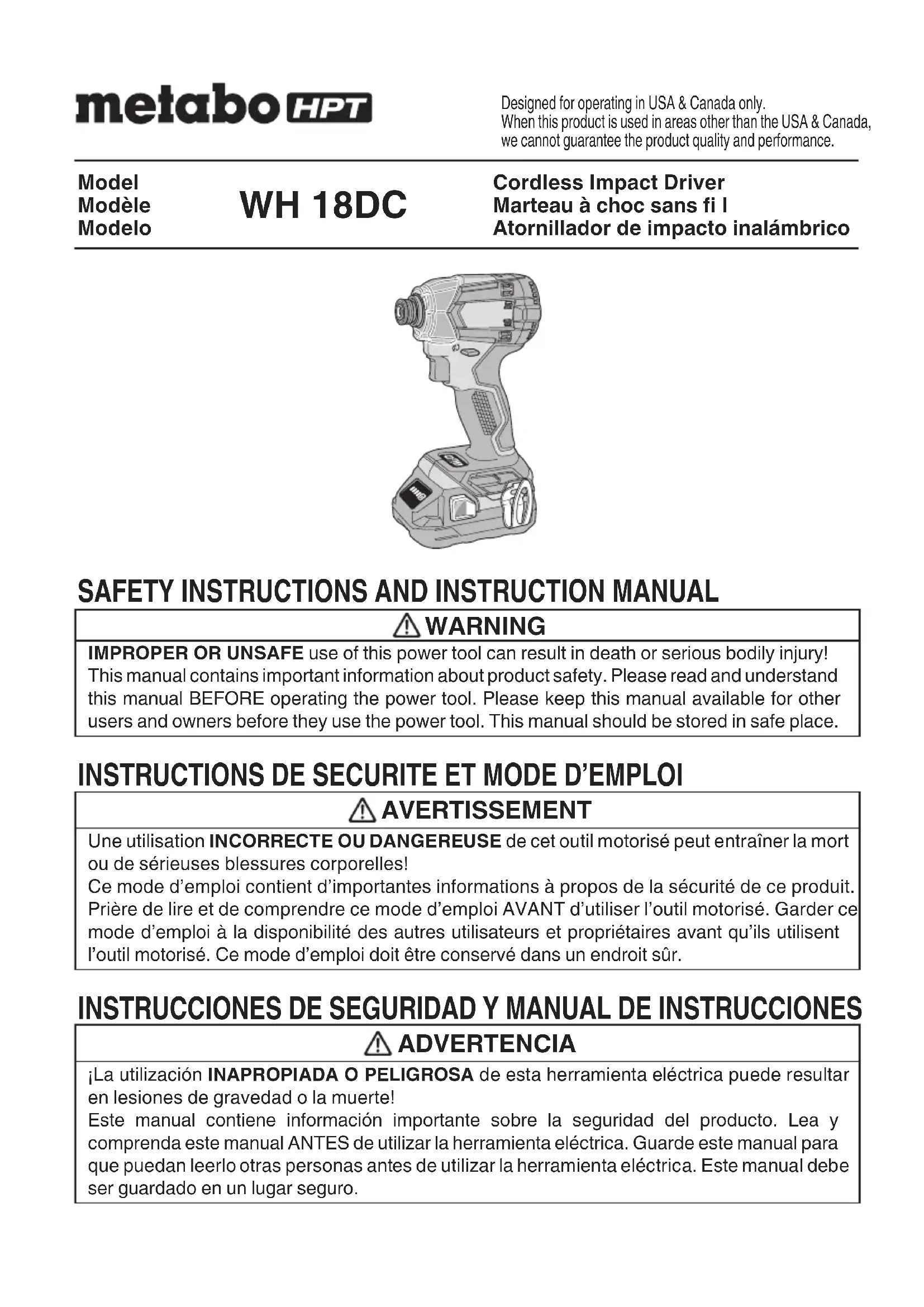 English 00BookWH18DCNA.indb2200BookWH18DCNA.indb22 2022/02/0214:53:082022/02/0214:53:08INFORMATIONS IMPORTANTES DE SÉCURITÉ Lire et comprendre toutes les précautions de sécurité, les avertissements et les instructions de fonctionnement dans ce mode d’emploi avant d’utiliser ou d’entretenir cet outil motorisé. La plupart des accidents causés lors de l’utilisation ou de l’entretien de l’outil motorisé proviennent d’un non respect des règles ou précautions de base de sécurité. Un accident peut la plupart du temps être évité si l’on reconnaît une situation de danger potentiel avant qu’elle ne se produise, et en observant les procédures de sécurité appropriées. Les précautions de base de sécurité sont mises en évidence dans la section “SECURITE” de ce mode d’emploi et dans les sections qui contiennent les instructions de fonctionnement et d’entretien. Les dangers qui doivent être évités pour prévenir des blessures corporelles ou un endommagement de la machine sont identifi és par AVERTISSEMENTS sur l’outil motorisé et dans ce mode d’emploi. NE JAMAIS utiliser cet outil motorisé d’une manière qui n’est pas spécifi quement recommandée par metabo HPT.