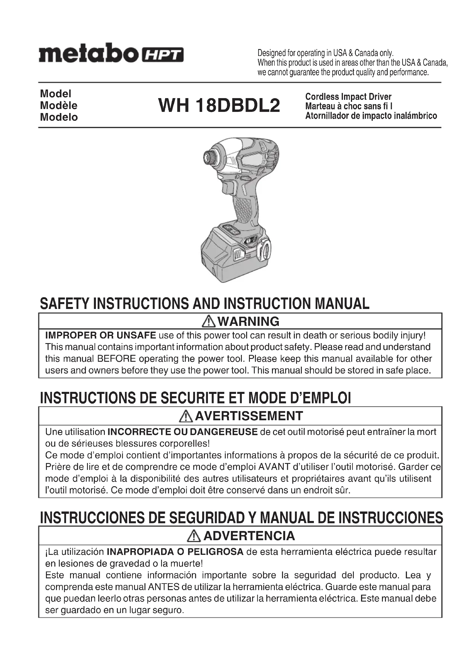 English 000WH18DBDL2metabo.indb24000WH18DBDL2metabo.indb24 2020/11/0610:24:392020/11/0610:24:39INFORMATIONS IMPORTANTES DE SÉCURITÉ Lire et comprendre toutes les précautions de sécurité, les avertissements et les instructions de fonctionnement dans ce mode d’emploi avant d’utiliser ou d’entretenir cet outil motorisé. La plupart des accidents causés lors de l’utilisation ou de l’entretien de l’outil motorisé proviennent d’un non respect des règles ou précautions de base de sécurité. Un accident peut la plupart du temps être évité si l’on reconnaît une situation de danger potentiel avant qu’elle ne se produise, et en observant les procédures de sécurité appropriées. Les précautions de base de sécurité sont mises en évidence dans la section “SECURITE” de ce mode d’emploi et dans les sections qui contiennent les instructions de fonctionnement et d’entretien. Les dangers qui doivent être évités pour prévenir des blessures corporelles ou un endommagement de la machine sont identifi és par AVERTISSEMENTS sur l’outil motorisé et dans ce mode d’emploi. NE JAMAIS utiliser cet outil motorisé d’une manière qui n’est pas spécifi quement recommandée par metabo HPT .