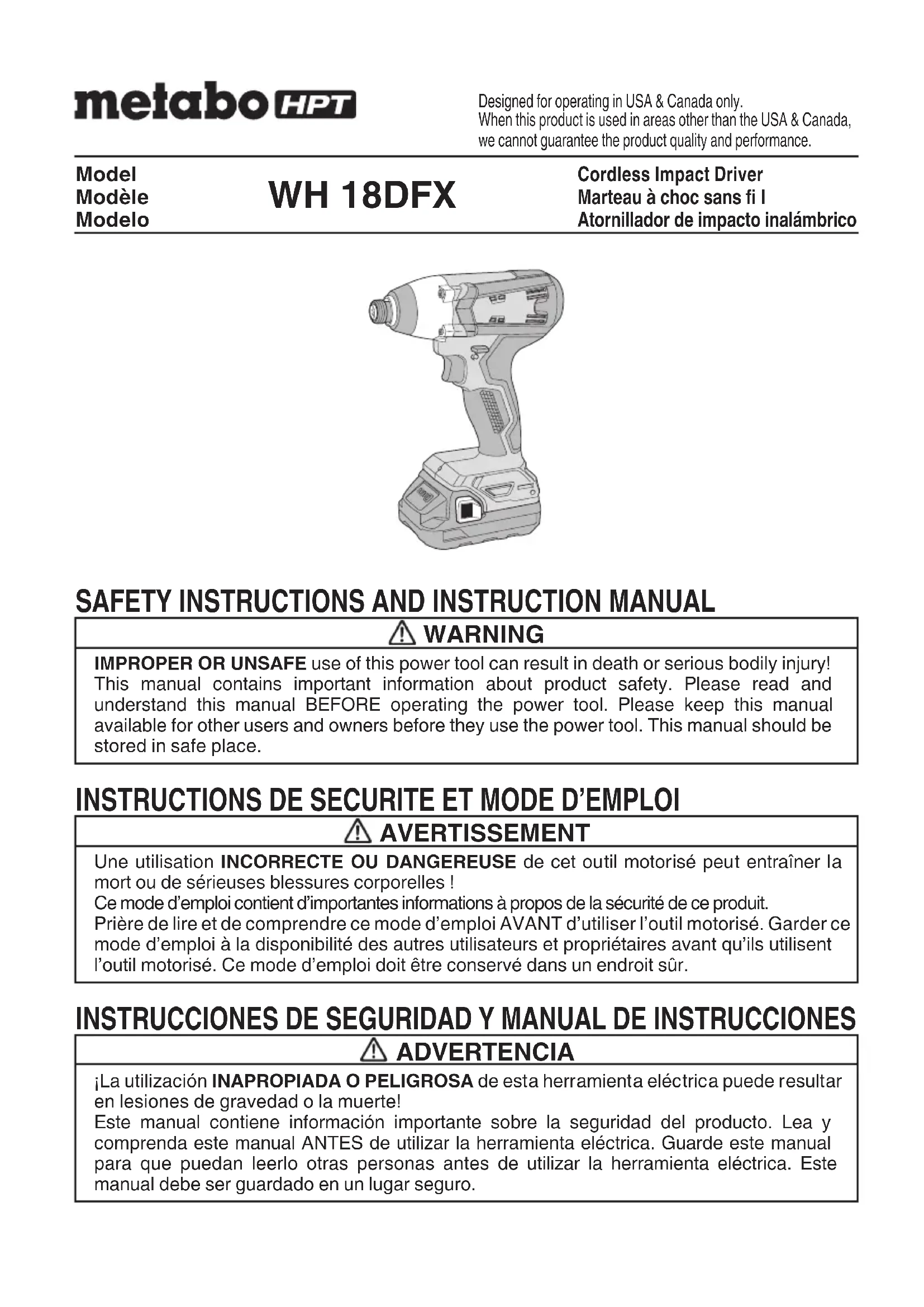 PROPRIETAIRES DE CET OUTIL! 000BookWH18DFXUSmetabo.indb23000BookWH18DFXUSmetabo.indb23 2021/10/088:42:252021/10/088:42:2524 Français REMARQUE Les informations contenues dans ce mode d’emploi sont conçues pour assister l’utilisateur dans une utilisation sans danger et un entretien de l’outil motorisé. NE JAMAIS utiliser ni entreprendre une révision de l’outil sans avoir d’abord lu et compris toutes les instructions de sécurité contenues dans ce manuel. Certaines illustrations dans ce mode d’emploi peuvent montrer des détails ou des accessoires diff érents de ceux de l’outil motorisé utilisé.