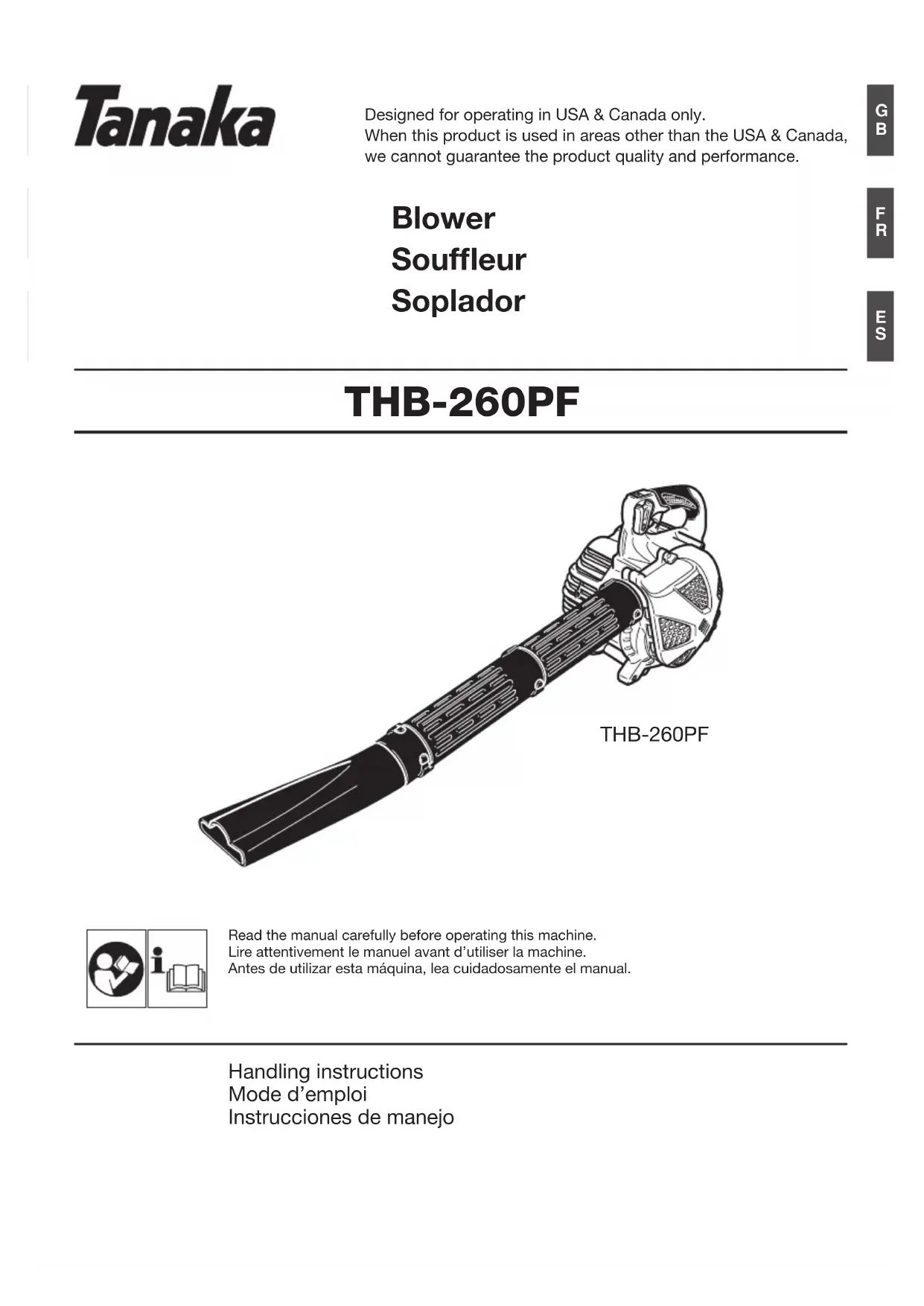 Assurez vous que le commutateur d’arrêt du moteur est bien sur la position "stop" lors du transport ou du remisage de la machine. Dans l’éventualité de situations qui ne seraient pas prises en compte par le présent manuel, redoublez d’attention et usez de bon sens. Communiquez avec un concessionnaire Tanaka pour toute assistance. 000BookTHB-260PFUS.indbFR-3000BookTHB-260PFUS.indbFR-3 2018/10/0117:14:202018/10/0117:14:20FR-4 Caractéristiques MODELE THB-260PF Taille du moteur (cu. in) 1.46 (23.9 ml) Bougie d’allumage NGK BMR7A Filtre à air A huilé le système de fi ltre de mousse Poids à sec (livre) 11.0 (5.0 kg) Contenance du réservoir de carburant (fl . oz)