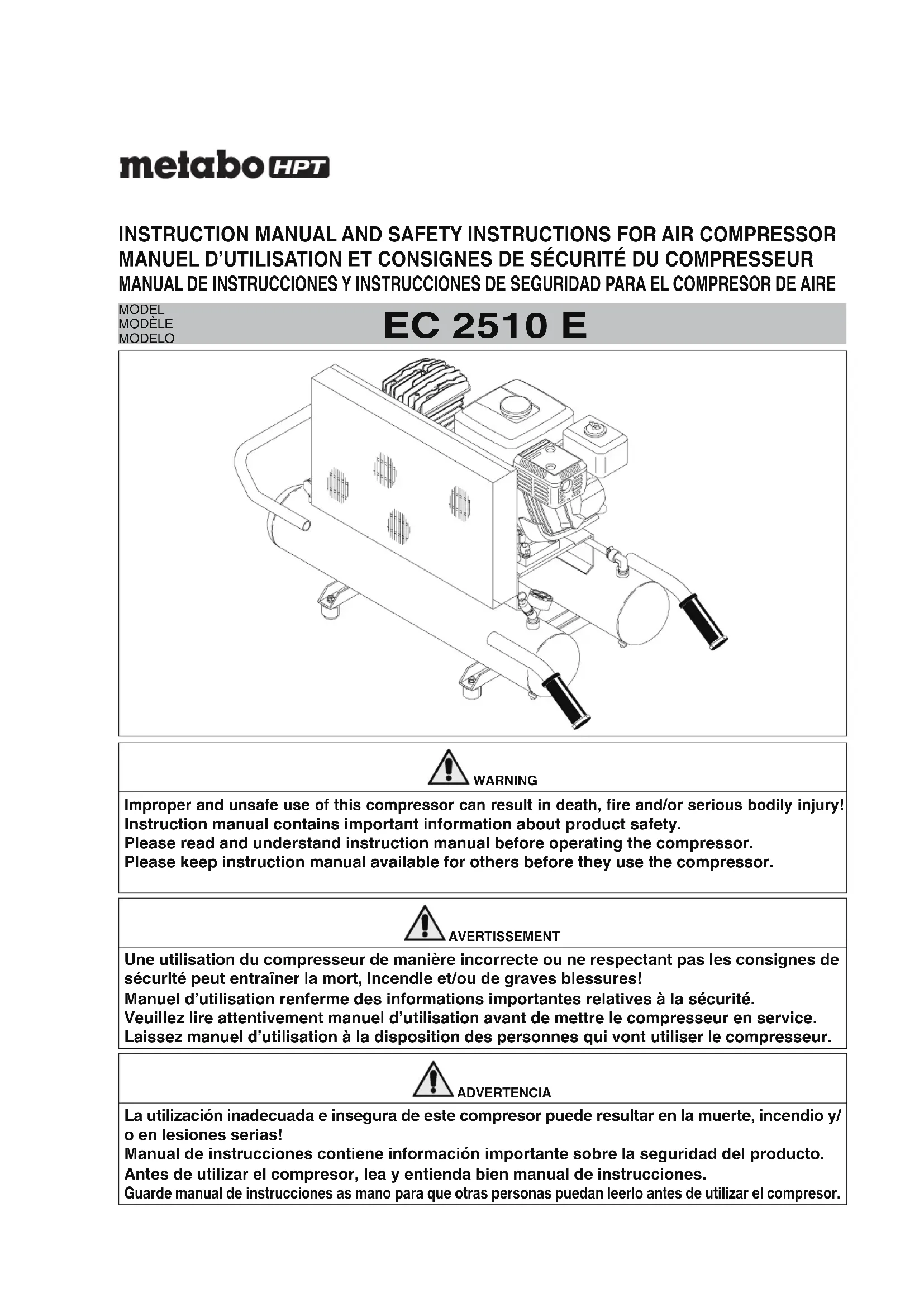All quality compressors will eventually require servicing or replacement of parts because of wear and tear from normal use. To assure that only authorized/genuine replacement parts will be used, all service and repairs must be performed by a metabo HPT AUTHORIZED SERVICE CENTER, only. NOTE: Specifications are subject to change without any obligation on the part of the metabo HPT.- 10 - Français INFORMATIONS IMPORTANTES Lisez attentivement toutes les instructions de fonctionnement, les précautions de sécurité et les avertissements figurant dans le Manuel d’instructions avant de mettre ce compresseur en service ou de le soumettre à des interventions d’entretien. La plupart des incidents dérivant de l’utilisation ou de l’entretien du compresseur est due au non-respect des règles ou précautions de sécurité de base. Souvent, il est possible d’éviter un accident en sachant reconnaître une situation potentiellement dangereuse avant qu’elle ne survienne et en observant les procédures de sécurité adéquates. Les précautions de sécurité de base sont résumées dans le chapitre “SECURITE” de ce manuel ainsi qu’aux chapitres relatifs aux instructions pour l’utilisation et l’entretien. Les risques à éviter pour prévenir les blessures aux personnes ou des dommages à la machine sont signalés par l’indication AVERTISSEMENT figurant sur le compresseur et dans le Manuel d’instructions. N’utilisez jamais ce compresseur de façon non spécifiquement recommandée par metabo HPT, à moins d’avoir préalablement vérifié et confirmé que l’utilisation programmée est sûre pour l’opérateur et les tiers.
