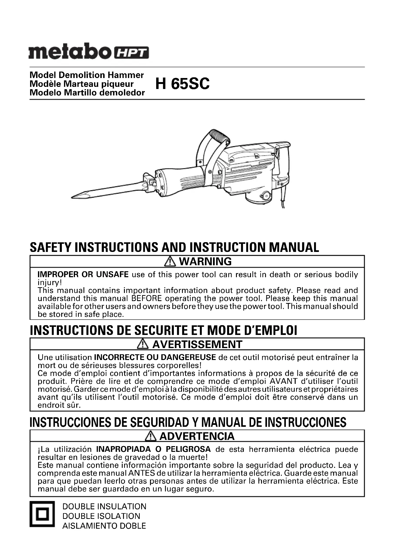 Model Demolition Hammer Modèle Marteau piqueur Modelo Martillo demoledor DOUBLE INSULATION DOUBLE ISOLATION AISLAMIENTO DOBLE INSTRUCTIONS DE SECURITE ET MODE D’EMPLOI AVERTISSEMENT Une utilisation INCORRECTE OU DANGEREUSE de cet outil motorisé peut entraîner la mort ou de sérieuses blessures corporelles! Ce mode d’emploi contient d’importantes informations à propos de la sécurité de ce produit. Prière de lire et de comprendre ce mode d’emploi AVANT d’utiliser l’outil motorisé. Garder ce mode d’emploi à la disponibilité des autres utilisateurs et propriétaires avant qu’ils utilisent l’outil motorisé. Ce mode d’emploi doit être conservé dans un endroit sûr.