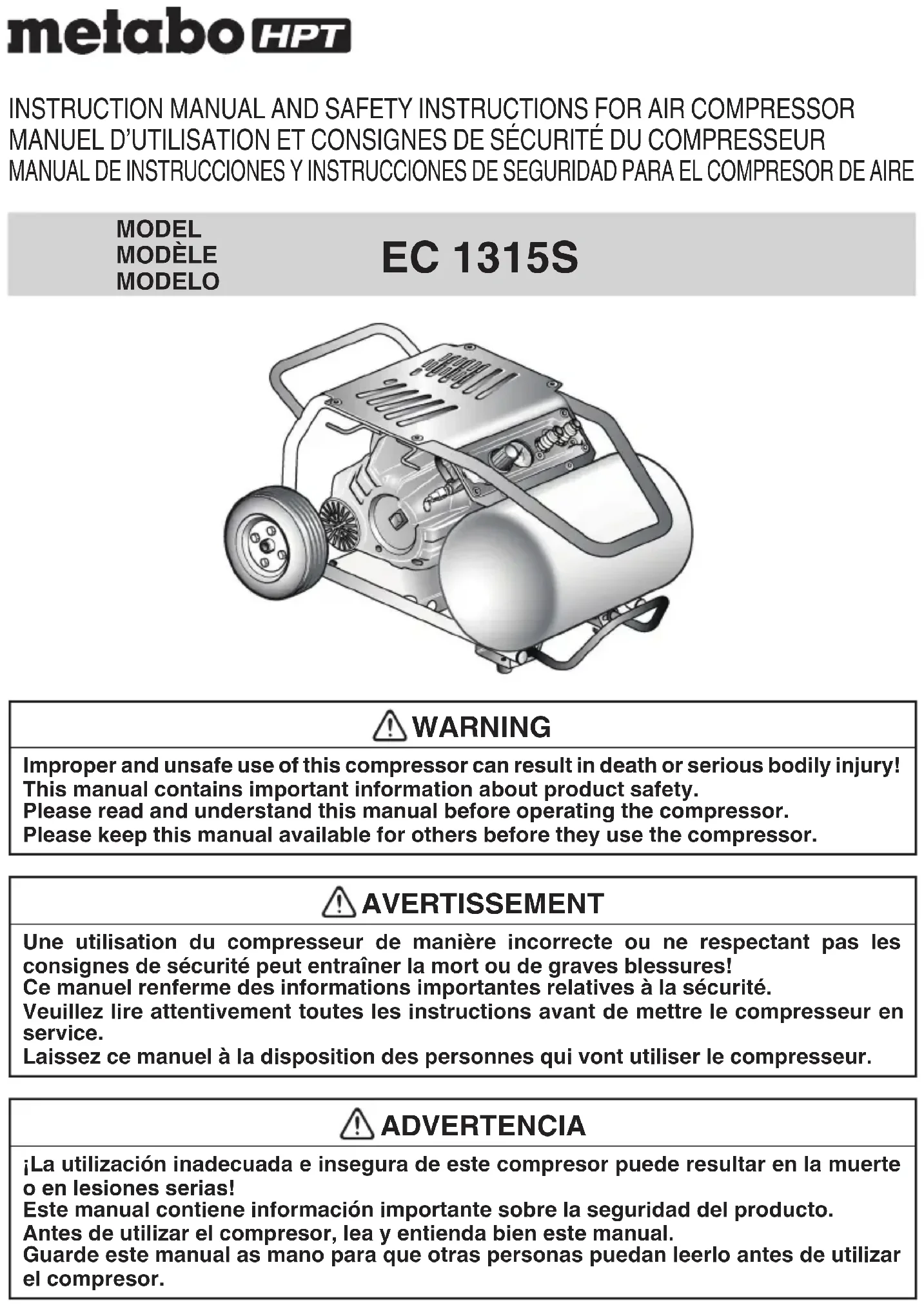 LES FUITES D’AIR. Avant de continuer à utiliser le compresseur, inspecter attentivement les protections ou autres pièces endommagées pour s’assurer que le compresseur pourra fonctionner correctement et eff ectuer le travail pour lequel il est conçu. Vérifi ez l’alignement et le couplage des pièces mobiles, la présence de pièces brisées, le montage, les fuites d’air et tout autre élément susceptible d’altérer le bon fonctionnement. Les protections ou autre composant endommagé doivent être réparés selon les règles de l’art ou remplacés par un centre de service après-vente autorisé metabo HPT. Tous les switches doivent etre rémplacés par un centre de service après-vente autorisé metabo HPT. Ne utiliser pas le compresseur si le switch est bloqué et on ne peut pas le positionner en position on/off .