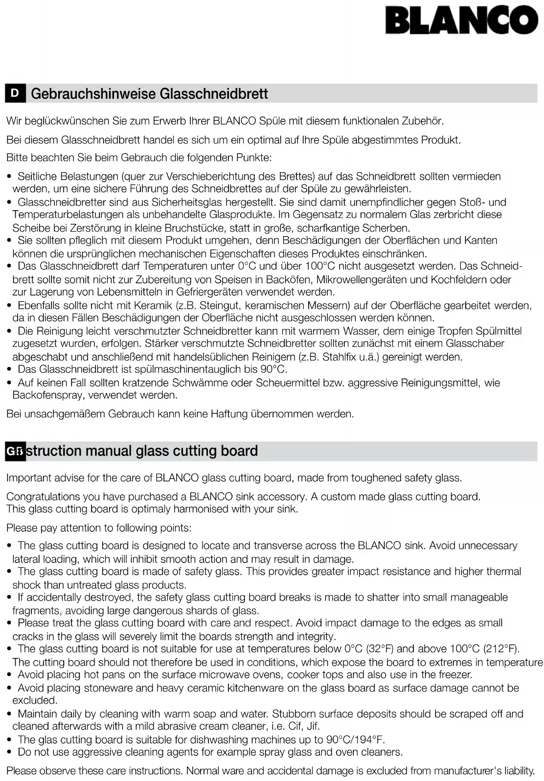 - Do not use aggressive cleaning agents for example spray glass and oven cleaners. Please observe these care instructions. Normal ware and accidental damage is excluded from manufacturer's liability.F Mode d’emploi de la planche à découper en verre sécurit Nous vous félicitons pour l’ acquisition de votre évier BLANCO et de cette planche à découper en verre sécurit. Cette planche à découper en verre sécurit est une option parfaitement adapté à votre évier BLANCO. Pour pleinement profiter de votre planche à découper en verre sécurit, veuillez respecter les consignes suivantes s’il vous plaît:
