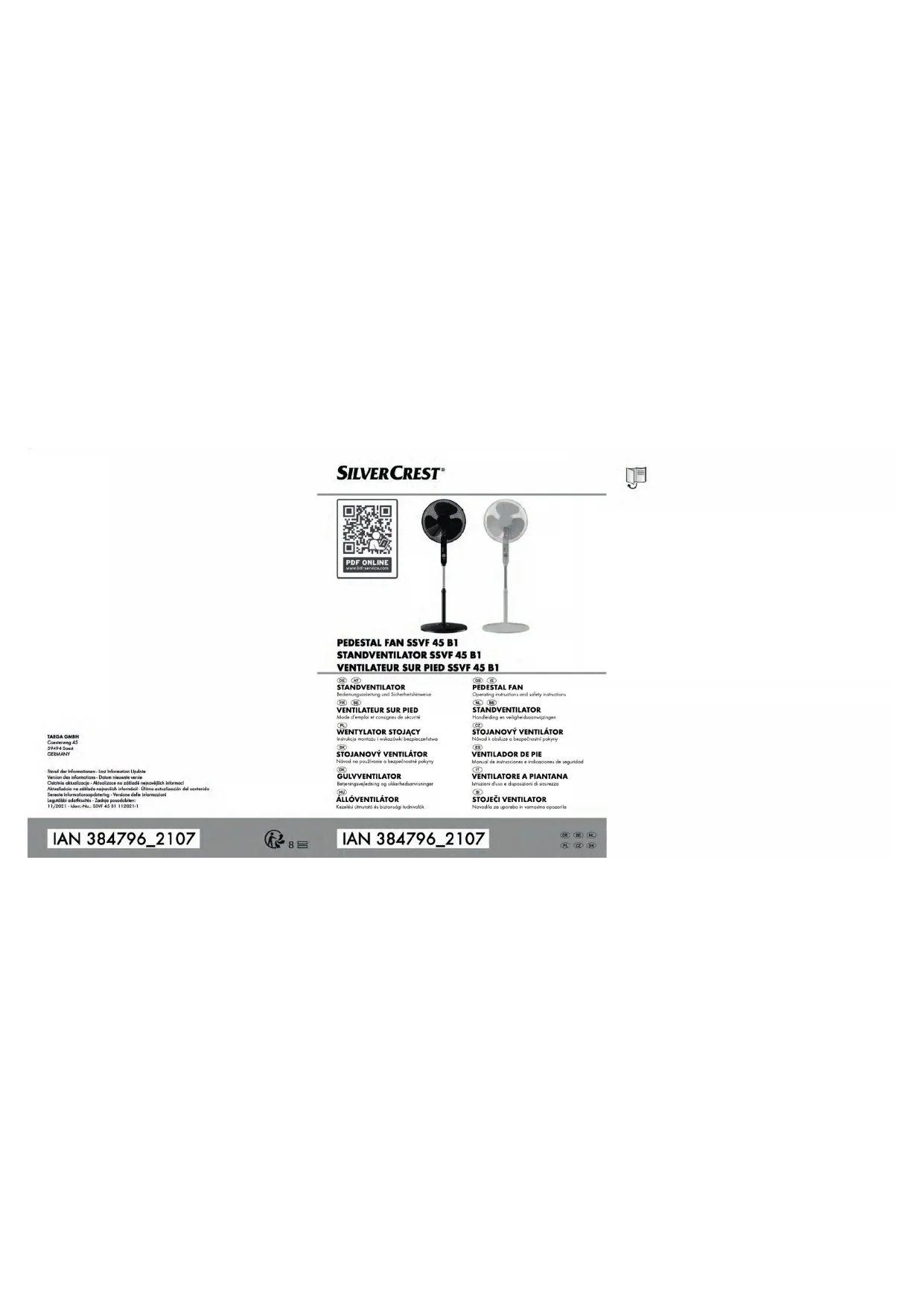 53,45 dB(A) Vitesse maximale de l’air c 2,83 m/s Consommation électrique saisonnière Q 13,68 kWh/a Norme de mesure de la valeur de service EN IEC 60879:2019 Coordonnées de contact pour tout complément d’information TARGA GmbH, Coesterweg 45, 59494 Soest, ALLEMAGNESilverCrest SSVF 45 B1 Français - 47