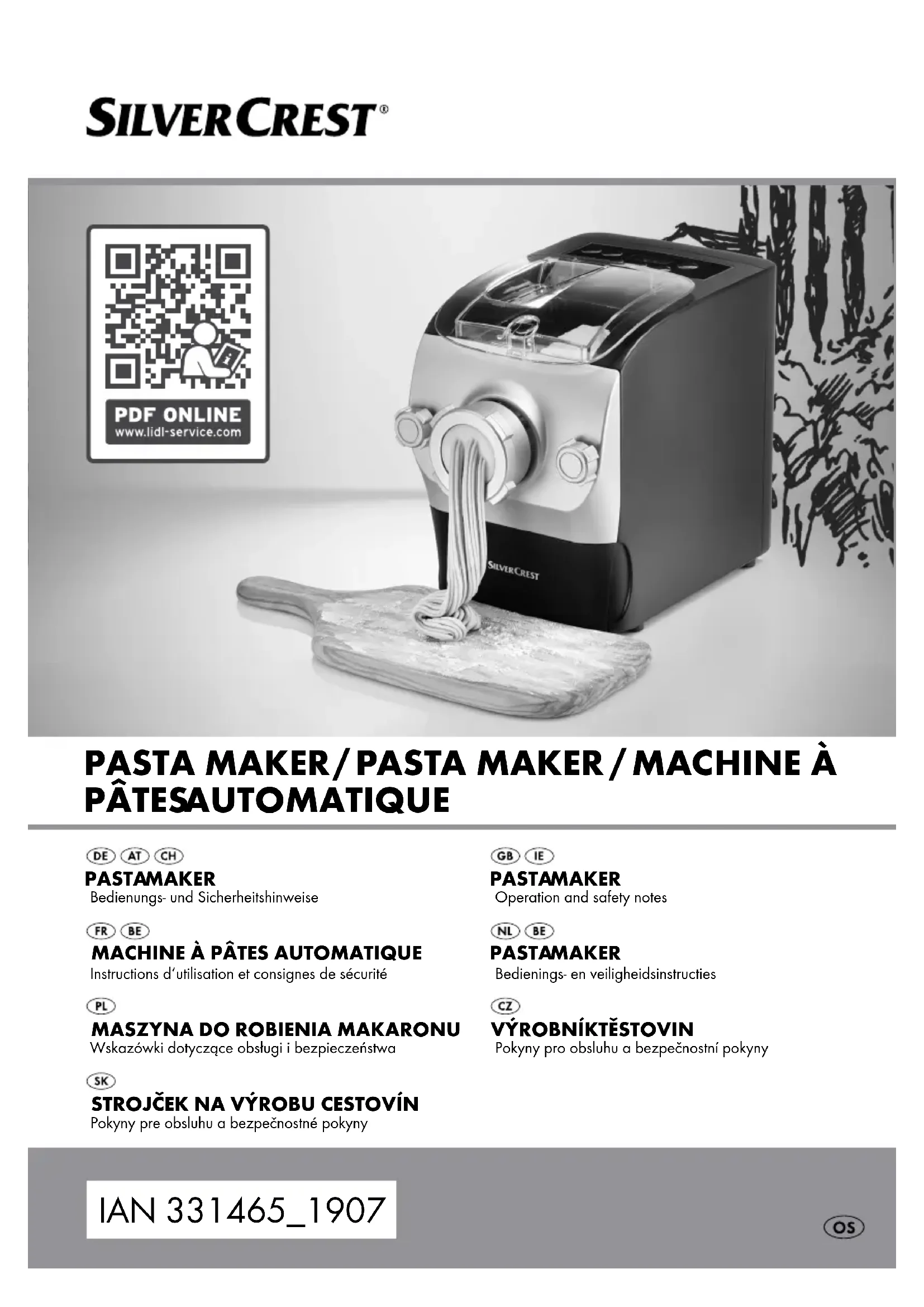 Mettez l'emballage et le produit au rebut en respectant l'environ- nement ! Watt (puissance active) 3 ans de garantie Consignes de sécurité Instructions de manipulation www.tuv.comID 1419065236 Certifié TÜV SÜD Certifié TÜV Rhénanie GS Machine à pâtes automatique Introduction Nous vous félicitons pour l‘achat de votre nouveau produit. Vous avez opté pour un produit de grande qualité. Le mode d‘emploi fait partie intégrante de ce produit. Il contient des indications importantes pour la sécurité, l’utilisation et la mise au rebut. Veuillez lire conscien- cieusement toutes les indications d‘utilisation et de sécurité du produit. Ce produit doit uniquement être utilisé conformément aux instructions et dans les do- maines d‘application spécifiés. Lors d‘une cession à tiers, veuillez également remettre tous les documents. Utilisation conforme Cette machine à pâtes est uniquement destinée à la fabrication de pâtes alimentaires. L‘appareil n‘est pas destiné à une utilisation commerciale dans des cuisines avec des employés, dans des magasins, bureaux, autres zones commerciales et ne doit éga- lement pas être utilisé par les clients d‘hôtels, de motels et autres établissements d‘hôtellerie ainsi que par les pensions servant des petits déjeuners. Il est uniquement destiné à un usage domestique privé. Toute autre utilisation ou modification de l’appareil est considérée comme non conforme et formellement interdite. Le fabricant n‘est pas responsable des dé- gâts occasionnés par une utilisation non conforme ou une mauvaise manipulation. Toute réclamation pour cause de dégâts résultant d‘une utilisation non conforme, de réparations incorrectes, de modifica- tions non autorisées ou de l‘utilisation de pièces de rechange non homologuées ne pourra être prise en compte. Le risque est à la charge de l‘utilisateur seul. Descriptif des pièces