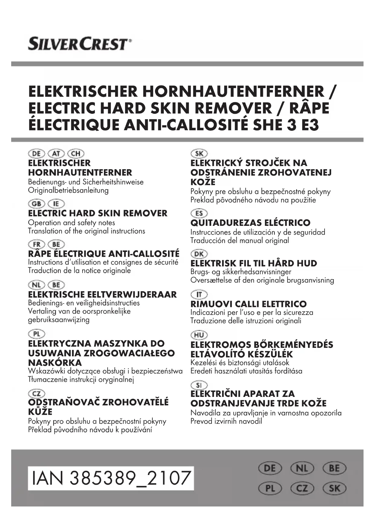 - s‘il présente les qualités qu‘un acheteur peut légitimement attendre eu égard aux déclarations publiques faites par le vendeur, par le producteur ou par son représentant, notamment dans la publicité ou l‘étiquetage ; 2° Ou s‘il présente les caractéristiques définies d‘un commun accord par les parties ou être propre à tout usage spécial recherché par l‘acheteur, porté à la connaissance du vendeur et que ce dernier a accepté. Article L217-12 du Code de la consommation L‘action résultant du défaut de conformité se prescrit par deux ans à compter de la délivrance du bien. Article 1641 du Code civil Le vendeur est tenu de la garantie à raison des défauts cachés de la chose vendue qui la rendent impropre à l‘usage auquel on la destine, ou qui diminuent tellement cet usage que l‘acheteur ne l‘aurait pas acquise, ou n‘en aurait donné qu‘un moindre prix, s‘il les avait connus.66 FR/BE Article 1648 1er alinéa du Code civil L‘action résultant des vices rédhibitoires doit être intentée par l‘acquéreur dans un délai de deux ans à compter de la découverte du vice. Les pièces détachées indispensables à l’utilisation du produit sont disponibles pendant la durée de la garantie du produit. Le produit a été fabriqué selon des critères de qualité stricts et contrôlé consciencieusement avant sa livraison. En cas de défaillance, vous êtes en droit de retourner ce produit au vendeur. La présente garantie ne constitue pas une restriction de vos droits légaux. Ce produit bénéficie d‘une garantie de 3 ans à compter de sa date d’achat. La durée de garantie débute à la date d’achat. Veuillez conserver le ticket de caisse original. Il fera office de preuve d’achat. Si un problème matériel ou de fabrication devait survenir dans 3 ans suivant la date d‘achat de ce produit, nous assurons à notre discrétion la réparation ou le remplacement du produit sans frais supplémentaires. La garantie prend fin si le produit est endommagé suite à une utilisation inappropriée ou à un entretien défaillant. La garantie couvre les vices matériels et de fabrication. Cette garantie ne s’étend ni aux pièces du produit soumises à une usure normale (p. ex. des piles) et qui, par conséquent, peuvent être considérées comme des pièces d’usure, ni aux dommages sur des composants fragiles, comme des interrupteurs, des batteries ou des éléments fabriqués en verre.67 FR/BE Faire valoir sa garantie Pour garantir la rapidité d’exécution de la procédure de garantie, veuillez respecter les indications suivantes : Veuillez conserver le ticket de caisse et la référence du produit (IAN 385389_2107) à titre de preuve d’achat pour toute demande. Le numéro de référence de l’article est indiqué sur la plaque d’identification, gravé sur la page de titre de votre manuel (en bas à gauche) ou sur un autocollant apposé sur la face arrière ou inférieure du produit. En cas de dysfonctionnement du produit, ou de tout autre défaut, contactez en premier lieu le service après-vente par téléphone ou par e-mail aux coordonnées indiquées ci-dessous. Vous pouvez alors envoyer franco de port tout produit considéré comme défectueux au service clientèle indiqué, accompagné de la preuve d’achat (ticket de caisse) et d’une description écrite du défaut avec mention de sa date d’apparition.68 FR/BE Service après-vente Service après-vente France Tél.: 0800904879 E-Mail: owim@lidl.fr Service après-vente Belgique Tél.: 080071011 Tél.: 80023970 (Luxembourg) E-Mail: owim@lidl.be69 FR/BE Déclaration UE de conformité70 NL/BE Overzicht gebruikte pictogrammen ... Pagina 71 Inleiding ................................... Pagina 71 Beoogd gebruik ............................. Pagina 72 Levering .................................... Pagina 72 Onderdelenbeschrijving ....................... Pagina 72 Technische gegevens .......................... Pagina 73 Veiligheidsaanwijzingen ................ Pagina 73 Veiligheidsaanwijzingen voor batterijen/ accu's. . . . . Pagina 78 Vóór het gebruik ......................... Pagina 81 Batterijen plaatsen/vervangen .................. Pagina 81 Bediening ................................. Pagina 82 Verschillende opzetstukken gebruiken ............. Pagina 82 Huidverzorging na gebruik ............. Pagina 83 Schoonmaken en onderhoud ........... Pagina 84 Roller vervangen ......................... Pagina 84 Afvoer ..................................... Pagina 85 Accessoires bestellen .................... Pagina 86 Garantie ................................... Pagina 87 Afwikkeling in geval van garantie ................ Pagina 88 Service ..................................... Pagina 89 EU-verklaring van overeenstemming .. Pagina 9071 NL/BE Overzicht gebruikte pictogrammen Gelijkstroom/-spanning Batterijen meegeleverd Het CE-teken bevestigt dat het product voldoet aan de betreffende EU-richtlijnen. ELEKTRISCHE EELTVERWIJDERAAR Inleiding Hartelijk gefeliciteerd met de aankoop van uw nieuwe product. U heeft voor een hoogwaardig product gekozen. De gebruiksaanwijzing is een deel van het product. Deze bevat belangrijke aanwijzingen voor veiligheid, gebruik en verwijdering. Maakt U zich voor de ingebruikname van het product met alle bedienings- en veiligheidsvoorschriften vertrouwd. Gebruik het product alleen zoals beschreven en voor de aangegeven toepassingsgebieden. Overhandig alle documenten bij doorgifte van het product aan derden.72 NL/BE Beoogd gebruik Dit product is uitsluitend bestemd voor het verwijderen van eelt van voeten, handen en ellebogen. Dit product mag niet worden gebruikt voor hoofd, slagaders of andere lichaamsdelen waarin zich veel bloedvaten bevinden. Dit product is uitsluitend bestemd voor privégebruik. Gebruik voor commerciële of andere doeleinden is niet toegestaan. Fabrikant, leverancier en tussenhandelaar aanvaarden geen aansprakelijkheid voor schade door onjuist