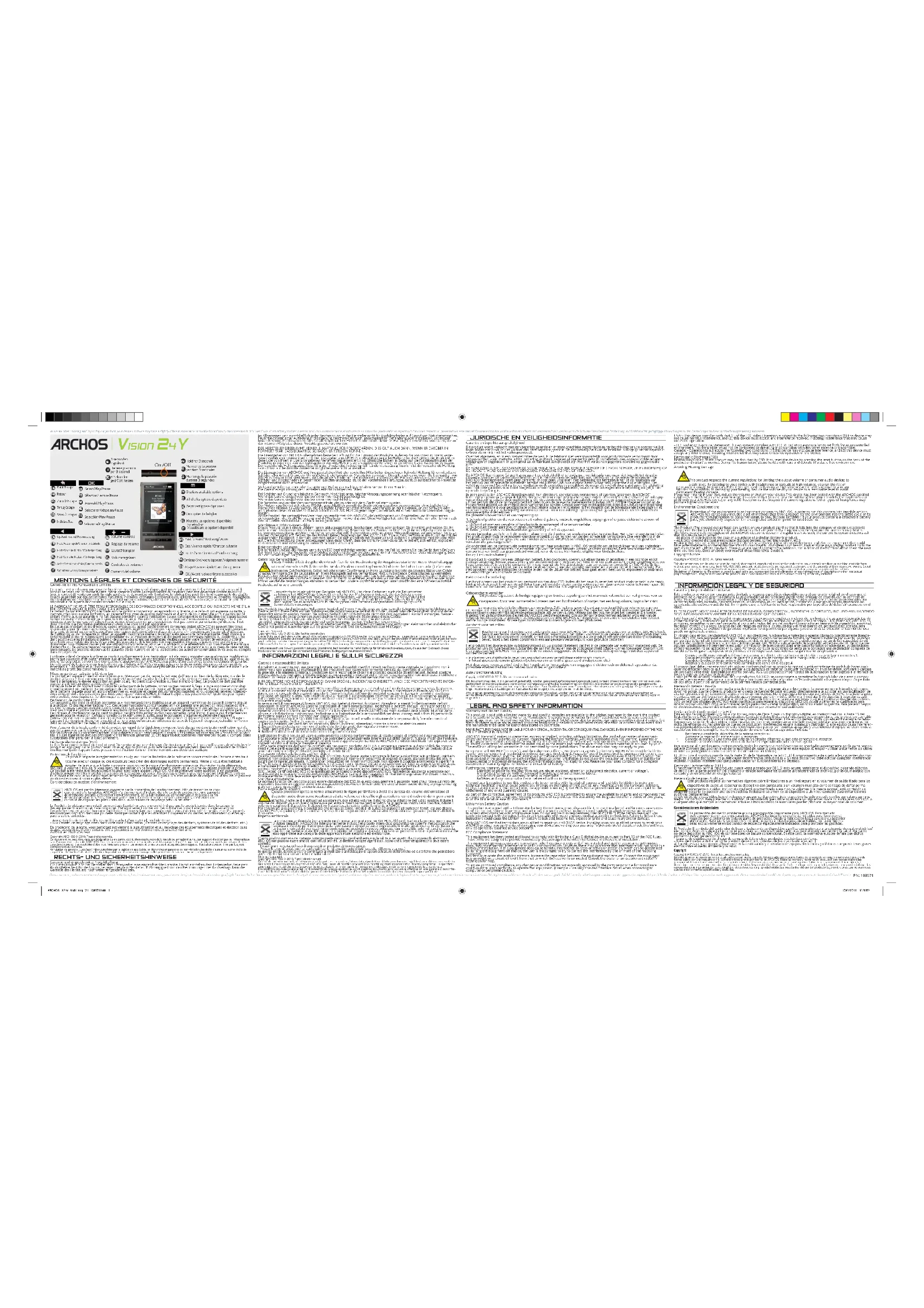 Ce produit est vendu avec une garantie limitée et des solutions spéciques sont mises à disposition de l’acheteur initial au cas où le produit ne serait pas conforme à cette même garantie limitée. La responsabilité du fabricant peut être davantage limitée en accord avec le contrat de vente consenti. En règle générale, et de manière non limitative, le fabricant ne peut être tenu responsable des dégâts causés au produit par des catastrophes naturelles, incendies, décharges électrostatiques, utilisations incorrectes ou abusives, négligences, manipulations ou installations incorrectes, réparations non autorisées, altérations ou accidents. En aucun cas, le fabricant ne peut être responsable de la perte de données stockées sur le disque. LE FABRICANT NE PEUT ÊTRE TENU RESPONSABLE DES DOMMAGES EXCEPTIONNELS, ACCIDENTELS OU INDIRECTS MEME S’IL A ETE INFORME DE CETTE EVENTUALITE A L’AVANCE. Le cédant (la société ARCHOS) n’accorde aucune garantie concernant les appareils sous licence, que celle-ci soit expresse ou tacite, y compris, mais sans aucune limitation, les garanties implicites de qualité marchande et d’aptitude pour atteindre un but particulier. Le cédant n’offre aucune garantie ni ne fait aucune démarche quant à l’utilisation ou aux conséquences de l’utilisation des appareils sous licence en matière d’exactitude, précision, abilité ou autre. En outre, en tant que cessionnaire vous assumez tout risque relatif aux résultats et performances de l’appareil sous licence. L’exclusion de garanties tacites n’est pas permise par certaines juridictions. Il est donc possible que l’exclusion mentionnée ci-dessus ne vous soit pas applicable. En aucun cas, le cédant et ses directeurs, cadres, employés ou agents (collectivement dénommés cédant ARCHOS) ne peuvent être tenus responsables pour des dommages consécutifs, accidentels ou indirects (y compris, sans que la liste soit exhaustive, des dommages provenant de la perte de bénéces commerciaux, d’une interruption de l’activité commerciale, de la perte d’informations professionnelles) découlant de l’utilisation, ou de l’incapacité à utiliser les appareils sous licence même si le cédant a été prévenu de cette éventualité. Étant donné que certaines juridictions ne reconnaissent pas l’exclusion ou la limitation de responsabilité quant aux dommages indirects ou accidentels, il est donc possible que les limitations stipulées ci-dessus ne vous soient pas applicables. Veuillez consulter votre contrat de vente pour obtenir la convention complète des droits de garantie, des solutions et de la limitation de responsabilité. De plus, la garantie ne couvre pas : les dommages ou problèmes causés par une utilisation incorrecte ou abusive, un accident, une altération ou un branchement électrique d’intensité ou de voltage tension inappropriée., les produits modiés, ni ceux dont le scellé de garantie ou le numéro de série ont été endommagés. les produits dépourvus de garantie ou de numéro de série. les batteries ou autres consommables livrés avec ou compris dans l’équipement. L’utilisateur nal s’engage à utiliser ce produit conformément à sa destination initiale, sans y apporter une quelconque modication technique susceptible de porter atteinte aux droits des tiers. Les modications apportées aux circuits électroniques, au logiciel ou au boîtier de ce produit doivent être expressément approuvées par ARCHOS, sous peine d’annulation de toutes les clauses de garantie. Dans le cadre de la garantie contractuelle de ses produits, ARCHOS s’engage à assurer la disponibilité des pièces et composants essentiels à l’utilisation et au fonctionnement des produits pendant une période de deux ans à compter de leur première mise sur le marché au prot des consommateurs. Mises en garde sur la batterie Lithium-ion ! Ce produit est équipé d’une batterie Lithium-ion. N’essayez pas de percer la batterie, de l’ouvrir ou bien de la démonter. Gardez le produit à l’abri de tout environnement humide et/ou corrosif. Gardez-le également à l’abri de toute source de chaleur (environne- ment à température élevée, exposition en plein soleil, récipient sous-pression ou four à micro-ondes). Le produit ne doit pas être exposé à une température supérieure à 60°C. En cas de fuite et de contact avec du liquide s’échappant de la batterie, rincez soigneusement à l’eau la zone exposée et consultez immédiatement un médecin. Le non-respect de ces recommandations risquerait de provoquer des fuites d’acide ou une surchauffe de la batterie, laquelle pourrait alors s’enammer ou exploser et causer des dommages matériels et/ou corporels sévères. Adressez- vous uniquement à des personnes qualiées pour réparer votre ARCHOS. En faisant appel à des personnes non qualiées pour réparer votre produit, vous risquez de l’endommager et de voir sa garantie annulée. Déclaration de conformité FCC Cet appareil a été testé et déclaré conforme aux recommandations établies pour un appareil numérique de classe B comme stipulé à la section 15 des réglementations FCC. Ces recommandations sont imposées an de garantir une protection raisonnable contre les interférences dans un environnement résidentiel. Cet appareil produit, utilise et peut émettre une énergie haute fréquence et, s’il n’est pas installé et utilisé conformément aux instructions, provoquer des interférences gênantes pour les communications radio. Des risques d’interférences ne peuvent toutefois pas être totalement exclus dans certaines installations. Dans le cas d’interférences gênantes pour la réception d’émissions radio ou télédiffusées (il suft, pour le constater, d’allumer et d’éteindre l’appareil), l’utilisateur est invité à prendre l’une des mesures suivantes pour les éliminer :Réorienter et déplacer l’antenne 