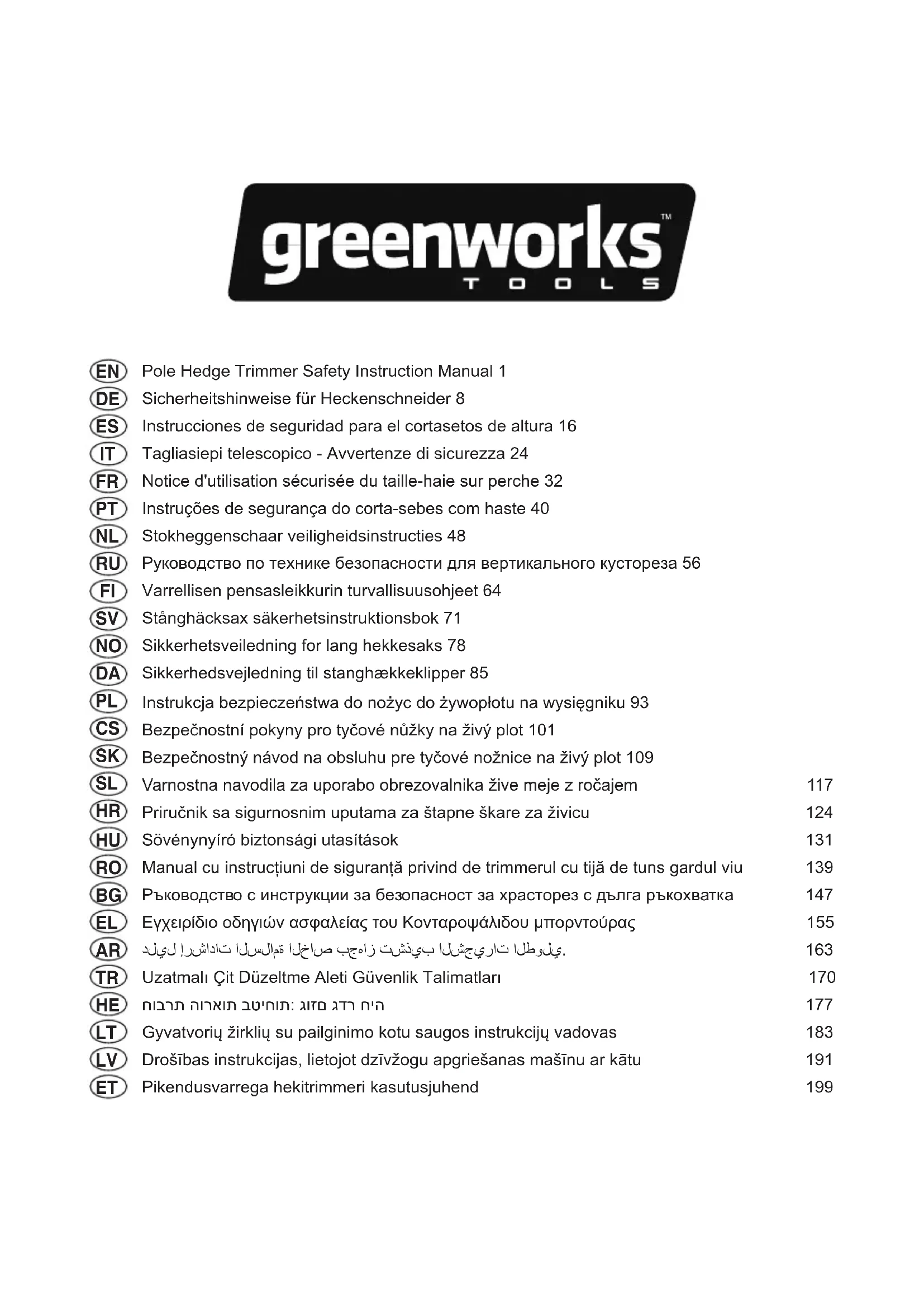DE ES IT PT NL RU FI SV NO DA PL CS SK SL HR HU RO BG EL AR TR HE LT LV ET Votre taille-haie sur perche a été conçu et fabriqué conformément aux standards élevés de Greenworks concernant la fiabilité, la facilité d’utilisation et la sécurité de l’utilisateur. Si vous l’utilisez et l’entretenez correctement, vous bénéficierez pendant de nombreuses années de ses performances, de sa fiabilité et de sa robustesse.