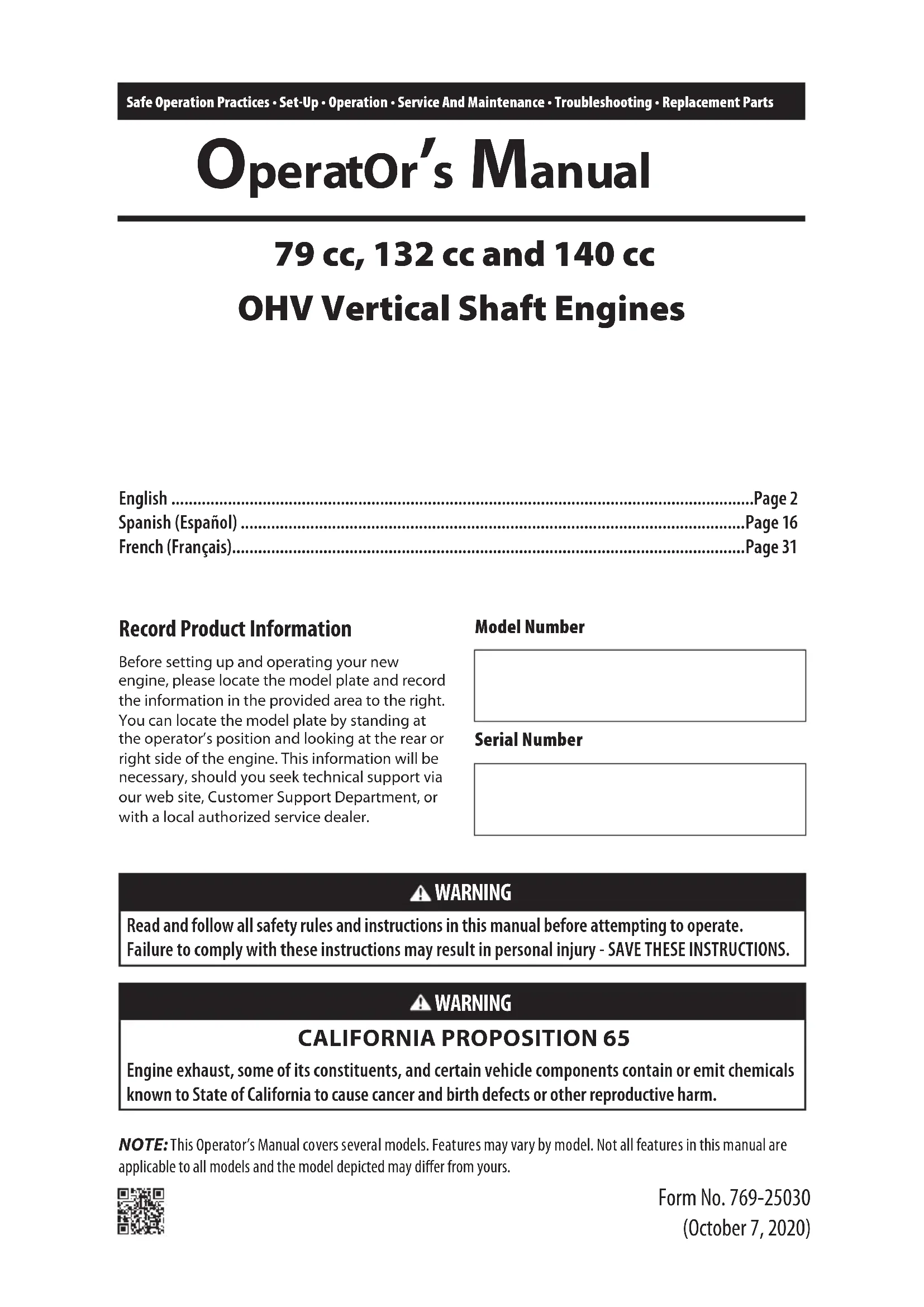 Les gaz d'échappement du moteur ainsi que certains éléments de l'appareil contiennent des substances considérées par l'État de Californie comme étant cancérigènes et pouvant provoquer des anomalies congénitales ainsi que d’autres effets nuisibles à la reproduction. Références de votre appareil Avant d’utiliser votre moteur, notez ci-contre les numéros de modèle et de série qui se trouvent sur la plaque signalétique. Pour trouver la plaque, tenez-vous derrière l’appareil et regardez à l’arrière ou à l’arrière droit du moteur. Il est important de conserver ces références car elles vous seront demandées si vous communiquez avec nous sur notre site web, par téléphone ou chez un concessionnaire. Numéro de modèle Numéro de série Anglais ......................................................................................................................................Page 2 Espagnol (Spanish) ..................................................................................................................Page 16 Français (French)Page ..............................................................................................................Page 3132