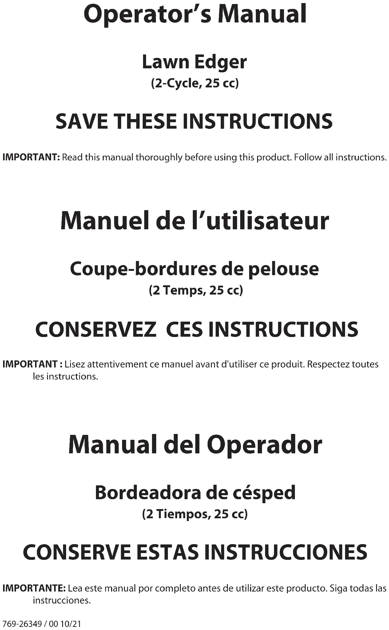 Coupe-bordures de pelouse (2 Temps, 25 cc) Manuel de l’utilisateur IMPORTANT : Lisez attentivement ce manuel avant d'utiliser ce produit. Respectez toutes les instructions.