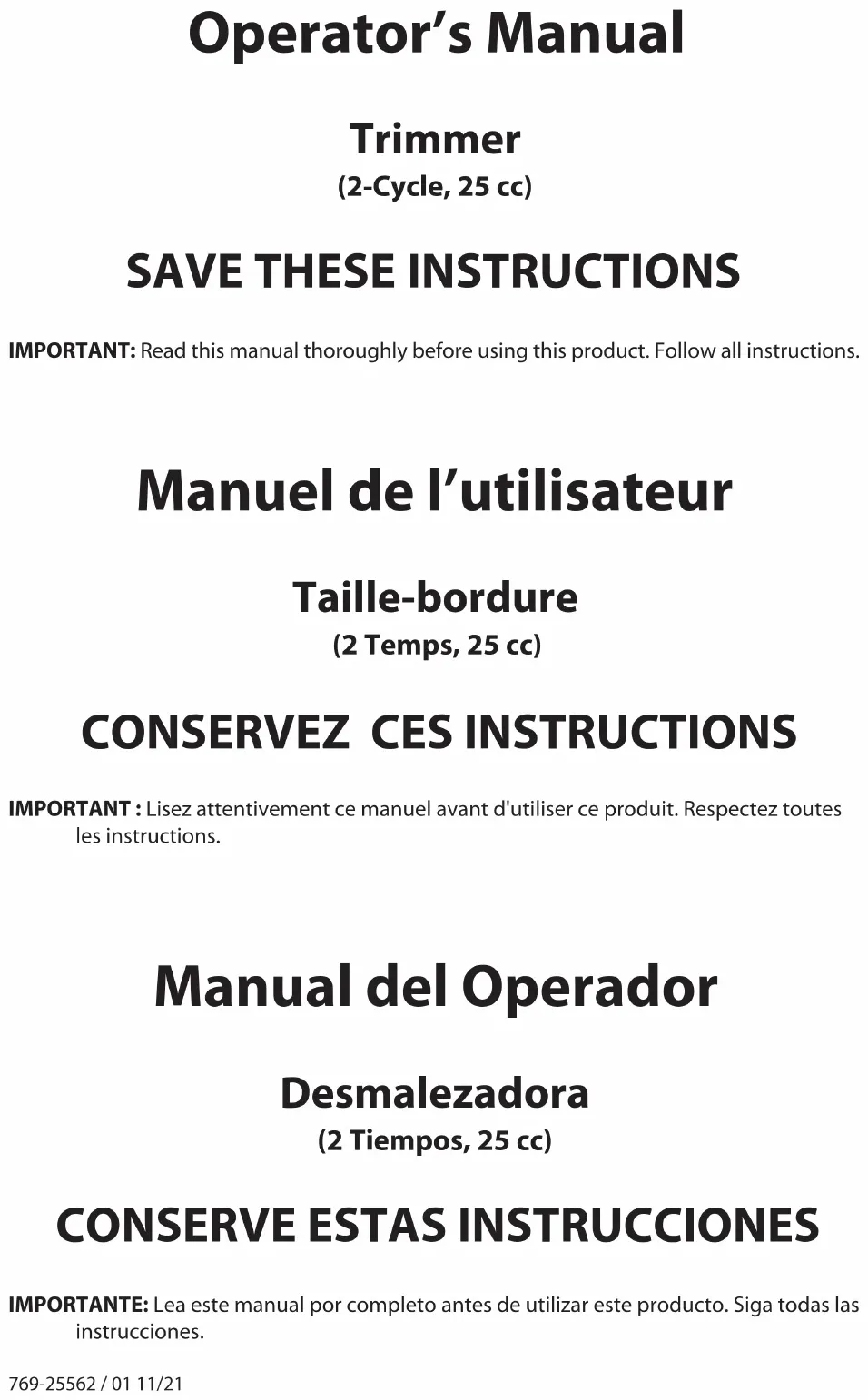 Taille-bordure (2 Temps, 25 cc) Manuel de l’utilisateur IMPORTANT : Lisez attentivement ce manuel avant d'utiliser ce produit. Respectez toutes les instructions.