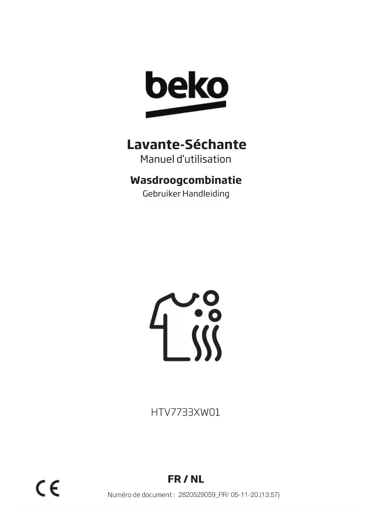 Lavante-Séchante Manuel d’utilisation Wasdroogcombinatie Gebruiker Handleiding HTV7733XW01 FR / NL 2820529059_FR/ 05-11-20.(13:57) Numéro de document :Ce produit a été fabriqué conformément aux conditions écologiques les plus récentes. Veuillez d’abord lire ce manuel d’utilisation ! Chère cliente, cher client, Nous vous remercions d'avoir choisi un appareil Beko. Nous espérons que ce produit fabriqué à base de matériaux de qualité supérieure et issu de la technologie de pointe vous donnera des résultats optimaux. Pour cette raison, nous vous conseillons de lire attentivement tout le manuel d’utilisation de votre produit et les documents supplémentaires avant de vous en servir, et de le conserver ensuite pour une utilisation ultérieure. Si l'appareil venait à être remis à un autre utilisateur, pensez à lui remettre aussi le manuel d'utilisation. Respectez tous les avertissements et informations contenus dans le manuel d'utilisation. Les symboles suivants sont utilisés tout au long du manuel d'utilisation :