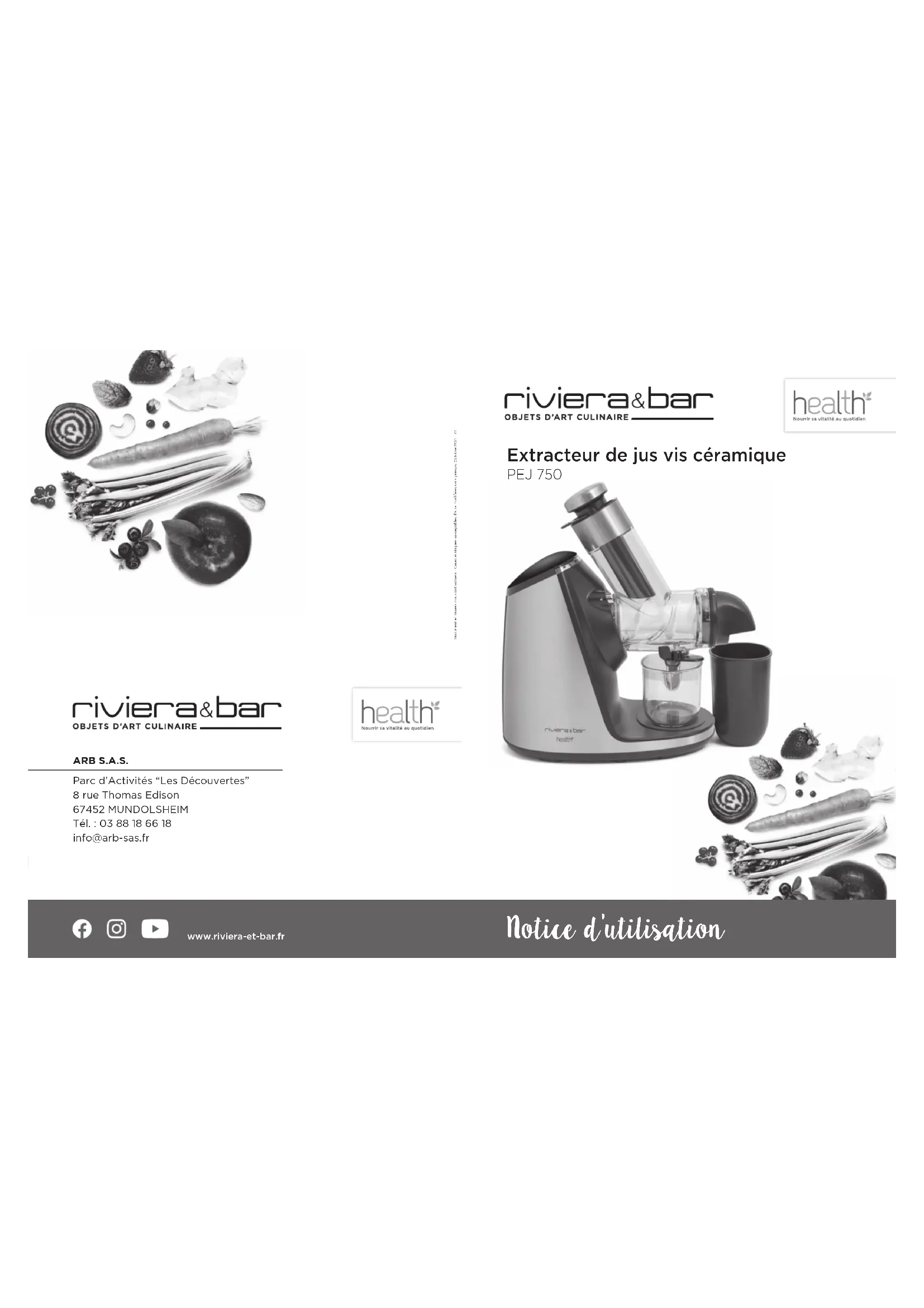 Notice d’utilisation ARB S.A.S. Parc d’Activités “Les Découvertes” 8 rue Thomas Edison 67452 MUNDOLSHEIM Tél. : 03 88 18 66 18 info@arb-sas.fr www.riviera-et-bar.fr Document et visuels non contractuels - Caractéristiques susceptibles d’être modifiées sans préavis. Octobre 2021 - V1 Extracteur de jus vis céramique PEJ 7503