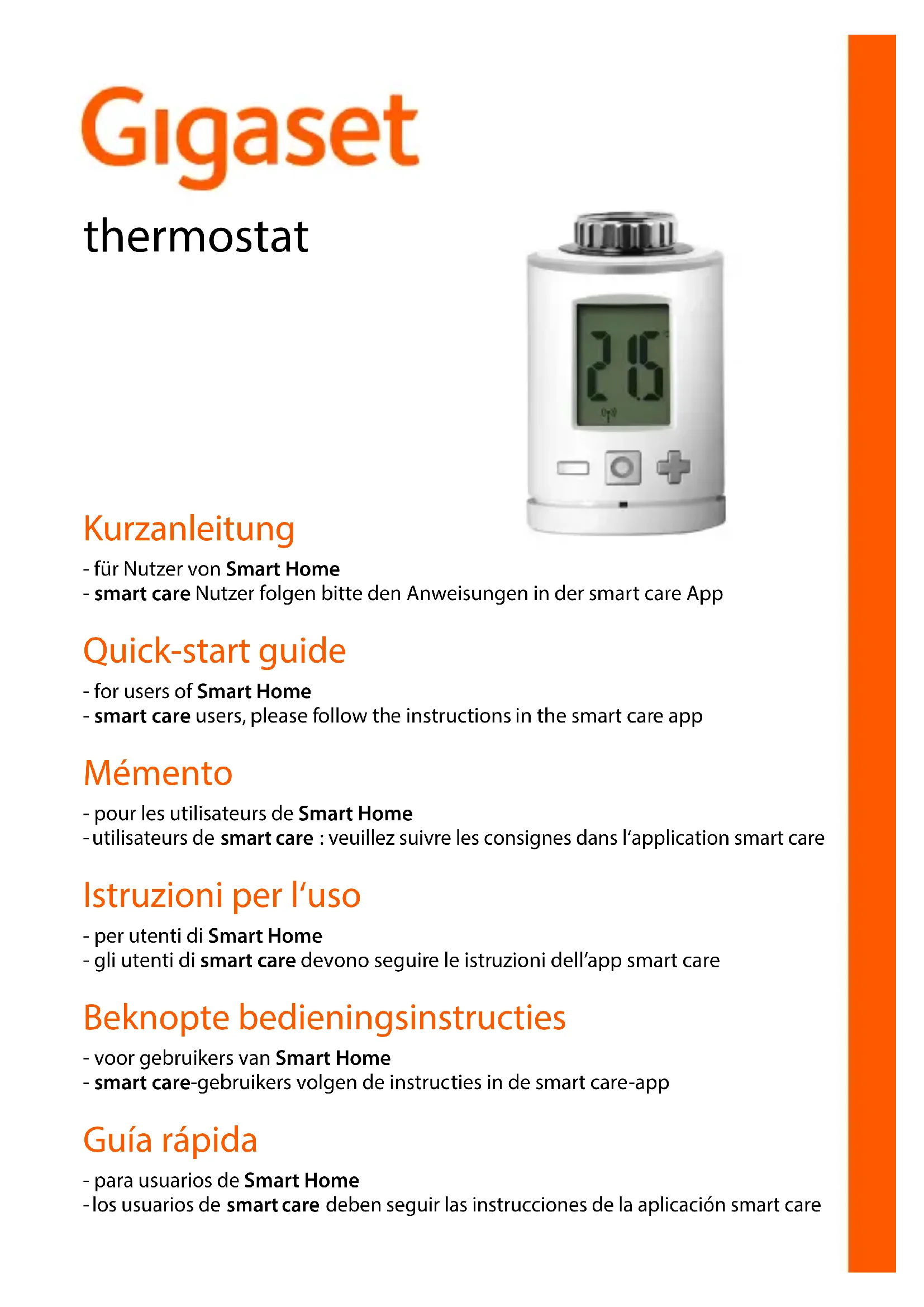 over the heating valve beforehand.elements / ALL IM DE-EN-FR-IT-NL-ES de-en-fr-it-nl-es / A31008-N2538-R101-2-4N19 / 01.09.2018 / 31.1.22 Template elements, Version 1, 100x143 / 01.09.2018 Montage de thermostat Installazione di thermostat Contrôlez d'abord de quelle société provient votre radiateur, car vous pouvez avoir besoin d'un adaptateur pour le montage. Vous trouverez une liste de compatibilité dans nos FAQ sur les thermostats www.gigaset.com/support