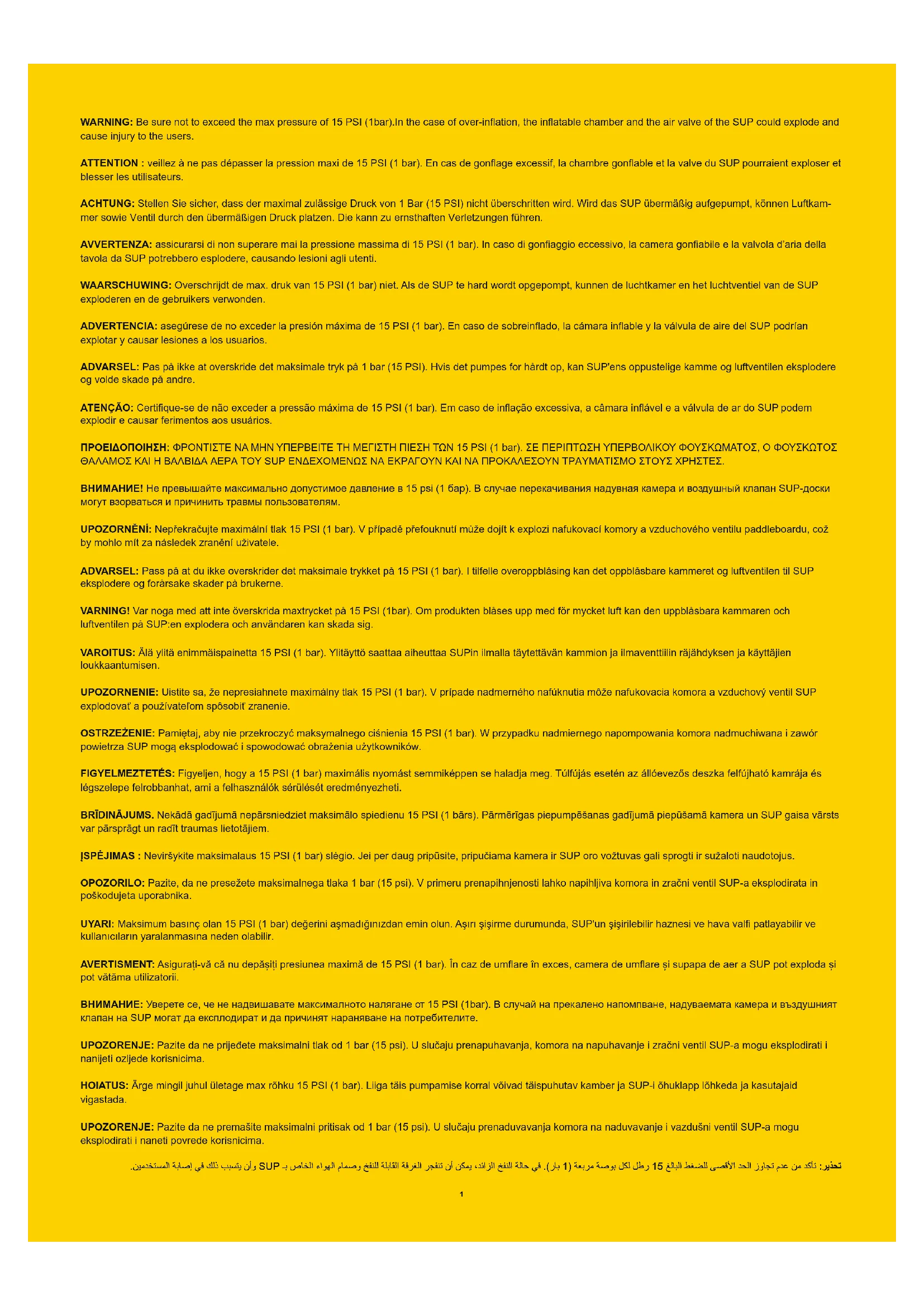 Lisez la notice et respectez les instructions relatives aux conseils de sécurité, au montage correct et complet du produit, à la mise en service, à l’utilisation et à l'entretien. Pour votre sécurité, lisez toujours les conseils et mises en garde contenus dans ces instructions. Le non-respect de ces instructions de fonctionnement peut vous exposer à des dangers graves voire mortels. N’utilisez le produit qu’aux endroits et dans les conditions pour lesquels il est prévu. Le pagayage debout est un sport dangereux. L’utilisation de ce produit expose l’utilisateur à des risques et des dangers inattendus. L’utilisateur doit avoir conscience de ces risques et les comprendre. L’utilisation de ce produit implique le respect des consignes de sécurité décrites dans la notice. Quel que soit le nombre de personnes à bord, le poids total des personnes et de l’équipement ne doit jamais dépasser la charge maximale recommandée. N’utilisez pas ce produit lorsque vous êtes sous l’influence d’alcool, de drogues ou de médicaments. Les dispositifs de secours comme les gilets et les bouées de sauvetage doivent être préalablement vérifiés et utilisés à chaque fois. Portez toujours un casque quand vous utilisez ce produit.Pagayez toujours avec un partenaire expérimenté quand vous utilisez ce produit.Communiquez à votre partenaire votre parcours de navigation et votre planning. Vérifiez préalablement les prévisions météo afin de connaître l’environnement marin et les conditions météo avant de partir. Une météo et un environnement marin mauvais sont extrêmement dangereux. N’utilisez jamais ce produit dans des conditions allant au-delà de vos capacités (comme par exemple, et sans que cette liste soit exhaustive, grosses vagues, contre-courants, courants et rapides). Utilisez le produit près de la rive et faites attention aux facteurs naturels comme le vent, les marées et les lames de fond. FAITES ATTENTION AUX VENTS DE TERRE ET AUX COURANTS. Avant toute utilisation, examinez soigneusement le produit pour vérifier s’il présente des signes d'usure ou de fuite afin d'être certain qu'il soit en bon état. N’utilisez pas le SUP si vous vous apercevez qu’il est endommagé.Ne surfez pas sur des plans d’eau que vous ne connaissez pas bien. Faites attention aux effets potentiellement nocifs des liquides comme l’acide de batterie, l’huile et le pétrole. Ces liquides peuvent endommager le produit. Gonflez à la pression nominale indiquée sur le produit sous peine de surgonflage et/ou d’explosion. Maintenez l’équilibre. Une distribution irrégulière des charges sur la planche peut provoquer un renversement qui pourrait entraîner la noyade. Apprenez à faire fonctionner ce produit. Adressez-vous à votre secteur local pour obtenir des informations et/ou une formation en cas de besoin. Informez-vous sur les réglementations locales et les dangers liés au surf, à la navigation et/ou à d’autres activités aquatiques.