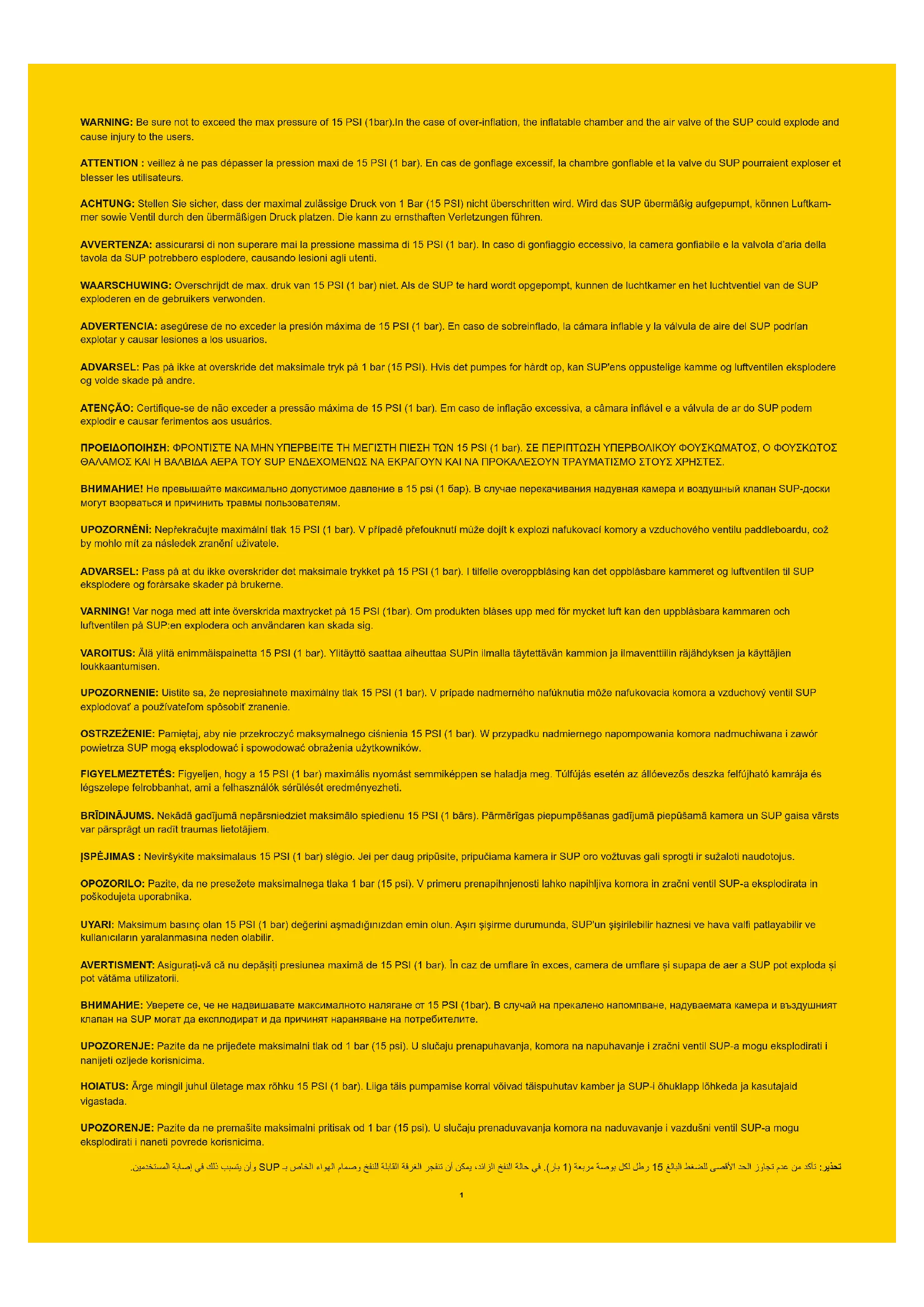 Lisez la notice et respectez les instructions relatives aux conseils de sécurité, au montage correct et complet du produit, à la mise en service, à l’utilisation et à l'entretien. Pour votre sécurité, lisez toujours les conseils et mises en garde contenus dans ces instructions. Le non-respect de ces instructions de fonctionnement peut vous exposer à des dangers graves voire mortels. N’utilisez le produit qu’aux endroits et dans les conditions pour lesquels il est prévu. Le pagayage debout est un sport dangereux. L’utilisation de ce produit expose l’utilisateur à des risques et des dangers inattendus. L’utilisateur doit avoir conscience de ces risques et les comprendre. L’utilisation de ce produit implique le respect des consignes de sécurité décrites dans la notice. Ne dépassez pas le nombre maximal de personnes recommandé. Quel que soit le nombre de personnes à bord, le poids total des personnes et de l’équipement ne doit jamais dépasser la charge maximale recommandée.N’utilisez pas ce produit lorsque vous êtes sous l’influence d’alcool, de drogues ou de médicaments. Les dispositifs de secours comme les gilets et les bouées de sauvetage doivent être préalablement vérifiés et utilisés à chaque fois. Portez toujours un casque quand vous utilisez ce produit.Pagayez toujours avec un partenaire expérimenté quand vous utilisez ce produit.Communiquez à votre partenaire votre parcours de navigation et votre planning. Vérifiez préalablement les prévisions météo afin de connaître l’environnement marin et les conditions météo avant de partir. Une météo et un environnement marin mauvais sont extrêmement dangereux. N’utilisez jamais ce produit dans des conditions allant au-delà de vos capacités (comme par exemple, et sans que cette liste soit exhaustive, grosses vagues, contre-courants, courants et rapides) Utilisez le produit près de la rive et faites attention aux facteurs naturels comme le vent, les marées et les lames de fond. FAITES ATTENTION AUX VENTS DE TERRE ET AUX COURANTS. Avant toute utilisation, examinez soigneusement le produit pour vérifier s’il présente des signes d'usure ou de fuite afin d'être certain qu'il soit en bon état. N’utilisez pas le SUP si vous vous apercevez qu’il est endommagé.Ne surfez pas sur des plans d’eau que vous ne connaissez pas bien. Faites attention aux effets potentiellement nocifs des liquides comme l’acide de batterie, l’huile et le pétrole. Ces liquides peuvent endommager le produit.Gonflez à la pression nominale indiquée sur le produit sous peine de surgonflage et/ou d’explosion. Maintenez l’équilibre. Une distribution irrégulière des charges sur la planche peut provoquer un renversement qui pourrait entraîner la noyade. Apprenez à faire fonctionner ce produit. Adressez-vous à votre secteur local pour obtenir des informations et/ou une formation en cas de besoin. Informez-vous sur les réglementations locales et les dangers liés au surf, à la navigation et/ou à d’autres activités aquatiques.
