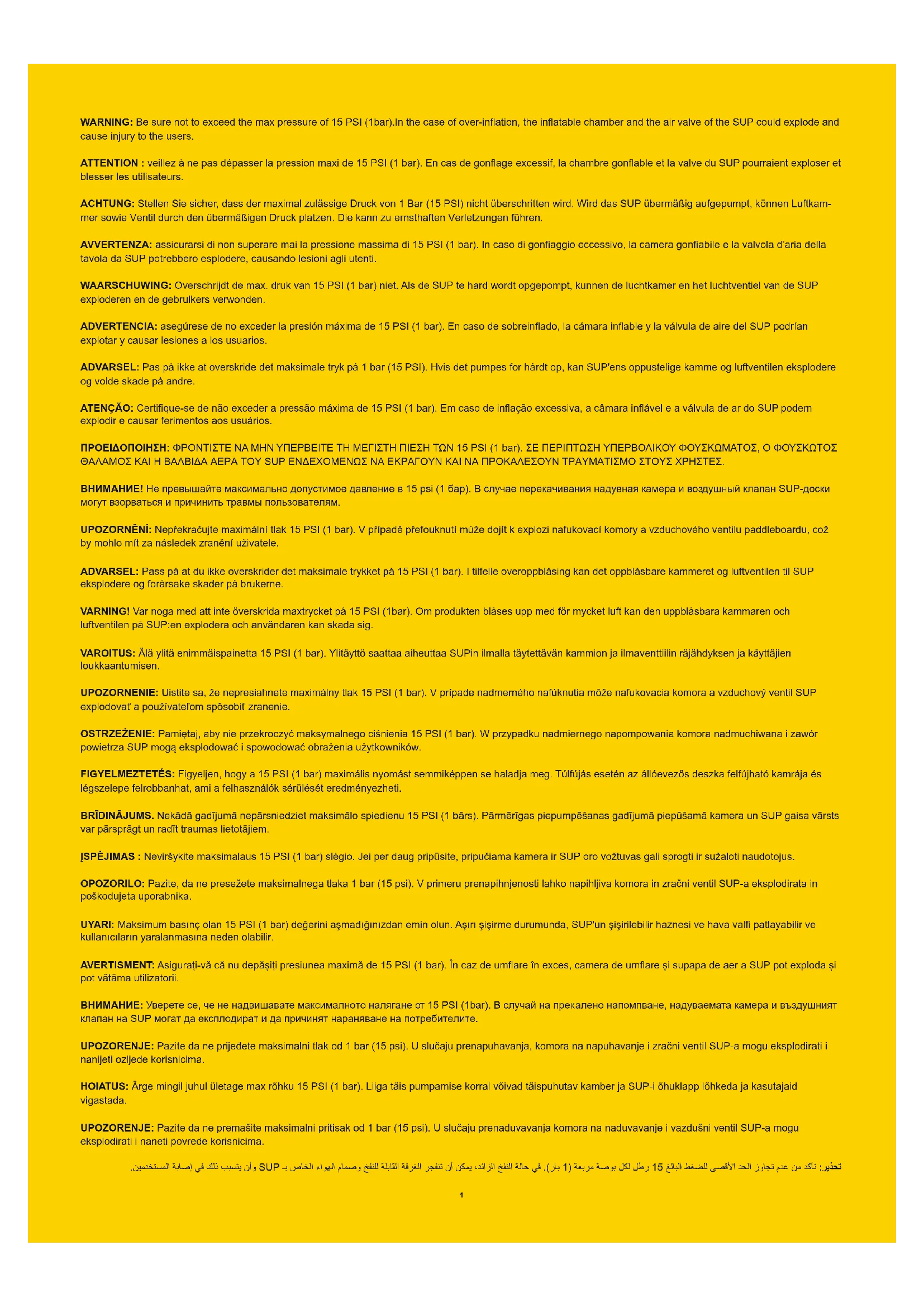 Lisez la notice et respectez les instructions relatives aux conseils de sécurité, au montage correct et complet du produit, à la mise en service, à l’utilisation et à l'entretien. Pour votre sécurité, lisez toujours les conseils et mises en garde contenus dans ces instructions. Le non-respect de ces instructions de fonctionnement peut vous exposer à des dangers graves voire mortels. N’utilisez le produit qu’aux endroits et dans les conditions pour lesquels il est prévu. Le pagayage debout est un sport dangereux. L’utilisation de ce produit expose l’utilisateur à des risques et des dangers inattendus. L’utilisateur doit avoir conscience de ces risques et les comprendre. L’utilisation de ce produit implique le respect des consignes de sécurité décrites dans la notice. Quel que soit le nombre de personnes à bord, le poids total des personnes et de l’équipement ne doit jamais dépasser la charge maximale recommandée. N’utilisez pas ce produit lorsque vous êtes sous l’influence d’alcool, de drogues ou de médicaments. Les dispositifs de secours comme les gilets et les bouées de sauvetage doivent être préalablement vérifiés et utilisés à chaque fois. Portez toujours un casque quand vous utilisez ce produit.Pagayez toujours avec un partenaire expérimenté quand vous utilisez ce produit.Communiquez à votre partenaire votre parcours de navigation et votre planning. Vérifiez préalablement les prévisions météo afin de connaître l’environnement marin et les conditions météo avant de partir. Une météo et un environnement marin mauvais sont extrêmement dangereux. N’utilisez jamais ce produit dans des conditions allant au-delà de vos capacités (comme par exemple, et sans que cette liste soit exhaustive, grosses vagues, contre-courants, courants et rapides). Utilisez le produit près de la rive et faites attention aux facteurs naturels comme le vent, les marées et les lames de fond. FAITES ATTENTION AUX VENTS DE TERRE ET AUX COURANTS. Avant toute utilisation, examinez soigneusement le produit pour vérifier s’il présente des signes d'usure ou de fuite afin d'être certain qu'il soit en bon état. N’utilisez pas le SUP si vous vous apercevez qu’il est endommagé.Ne surfez pas sur des plans d’eau que vous ne connaissez pas bien. Faites attention aux effets potentiellement nocifs des liquides comme l’acide de batterie, l’huile et le pétrole. Ces liquides peuvent endommager le produit. Gonflez à la pression nominale indiquée sur le produit sous peine de surgonflage et/ou d’explosion. Maintenez l’équilibre. Une distribution irrégulière des charges sur la planche peut provoquer un renversement qui pourrait entraîner la noyade. Apprenez à faire fonctionner ce produit. Adressez-vous à votre secteur local pour obtenir des informations et/ou une formation en cas de besoin. Informez-vous sur les réglementations locales et les dangers liés au surf, à la navigation et/ou à d’autres activités aquatiques.