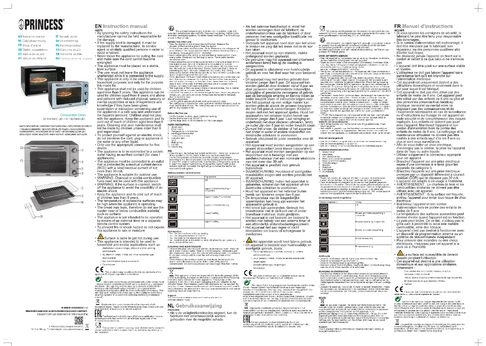 - N'immergez pas l'appareil dans de l'eau ou dans d'autres liquides. Ne mettez pas l'appareil au lave-vaisselle. Si l'intérieur du four est sale, son fonctionnement peut s'en trouver affecté et les temps de cuisson peuvent être allongés. ENVIRONNEMENT Cet appareil ne doit pas être jeté avec les déchets ménagers à la fin de sa durée de vie, il doit être remis à un centre de recyclage pour les appareils électriques et électroniques. Ce symbole sur l'appareil, le manuel d'utilisation et l'emballage attire votre attention sur un point important. Les matériaux utilisés dans cet appareil sont recyclables. En recyclant vos appareils, vous contribuez de manière significative à la protection de notre environnement. Renseignez-vous auprès des autorités locales pour connaître les centres de collecte des déchets. Support Vous retrouvez toutes les informations et pièces de rechange sur www.princesshome.eu! DEBedienungsanleitung SICHERHEIT