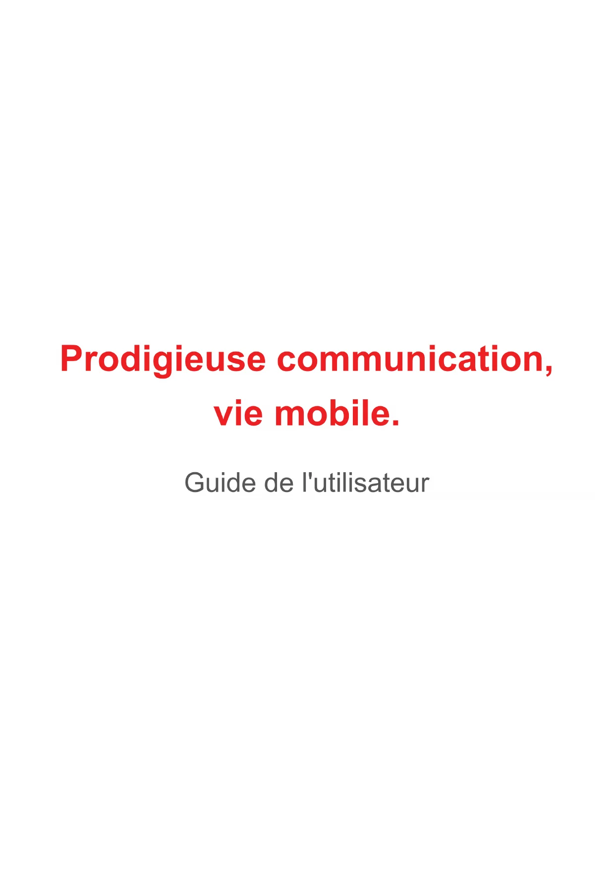 Prodigieuse communication, vie mobile. Guide de l'utilisateurAvis Copyright © Huawei Technologies Co., Ltd. 2010. Tous droits réservés. Il est interdit de reproduire ou de transmettre une partie quelconque de ce document, sous quelque forme ou de quelque façon que ce soit, sans l’autorisation écrite préalable de Huawei Technologies Co., Ltd. Le produit décrit dans le présent guide peut comprendre un logiciel protégé par un droit d’auteur appartenant à Huawei Technologies Co., Ltd et à de possibles donneurs de licences. Il est interdit au client de reproduire, de distribuer, de modifier, de décompiler, de désassembler, de décrypter, d’extraire, de rétroconcevoir, de louer, de céder ou d’accorder une sous-licence dudit logiciel, de quelque manière que ce soit, à moins que ces restrictions soient par la législation applicable ou que ces actions aient été approuvées par les détenteurs autorisés des copyrights respectifs. Marques déposées et permission , HUAWEI, et sont des marques de commerce ou des marques déposées de Huawei Technologies Co., Ltd. Les autres noms de marques de commerce, de produits, de services et d’entreprises mentionnés appartiennent à leurs propriétaires respectifs. Avis Certaines fonctions du produit et des accessoires décrits dans le présent document dépendent du logiciel installé ainsi que des capacités et des paramètres du réseau local, et il est possible qu’elles soient désactivées ou limitées par les opérateurs réseau ou les fournisseurs de services locaux; les descriptions figurant dans le présent document peuvent doncne pas correspondre exactement au produit ou aux accessoires dont vous avez fait l’achat. Huawei Technologies Co., Ltd se réserve le droit de modifier sans préavis ni obligation les informations ou les spécifications figurant dans le présent guide. Ce téléphone cellulaire vous permet de télécharger certains produits, y compris mais non de façon limitative le texte, les images, la musique, les films et le logiciel non intégré disposant de la protection du droit d’auteur. Toutefois, Huawei Technologies Co., Ltd. n’est pas responsable de la légitimité et de la qualité de ces produits. De ce fait, vous devez supporter seul les conséquences découlant de l'installation ou de l'utilisation des produits cités précédemment sur ce téléphone cellulaire. AUCUNE GARANTIE LE CONTENU DU PRÉSENT GUIDE EST FOURNI « TEL QUEL ». SOUS RÉSERVE DES LOIS APPLICABLES, AUCUNE GARANTIE SOUS QUELQUE FORME QUE CE SOIT, EXPLICITE OU IMPLICITE, Y COMPRIS, MAIS SANS S’Y LIMITER, LES GARANTIES IMPLICITES DE QUALITÉ MARCHANDE ET D’ADÉQUATION À UN USAGE PARTICU- LIER, N’EST ACCORDÉE QUANT À L’EXACTITUDE, À LA FIABILITÉ OU AU CONTENU DU PRÉSENT GUIDE. DANS LA LIMITE PERMISE PAR LES LOIS EN VIGUEUR, HUAWEI TECHNOLOGIES CO., LTD NE SERA EN AUCUN CAS TENUE