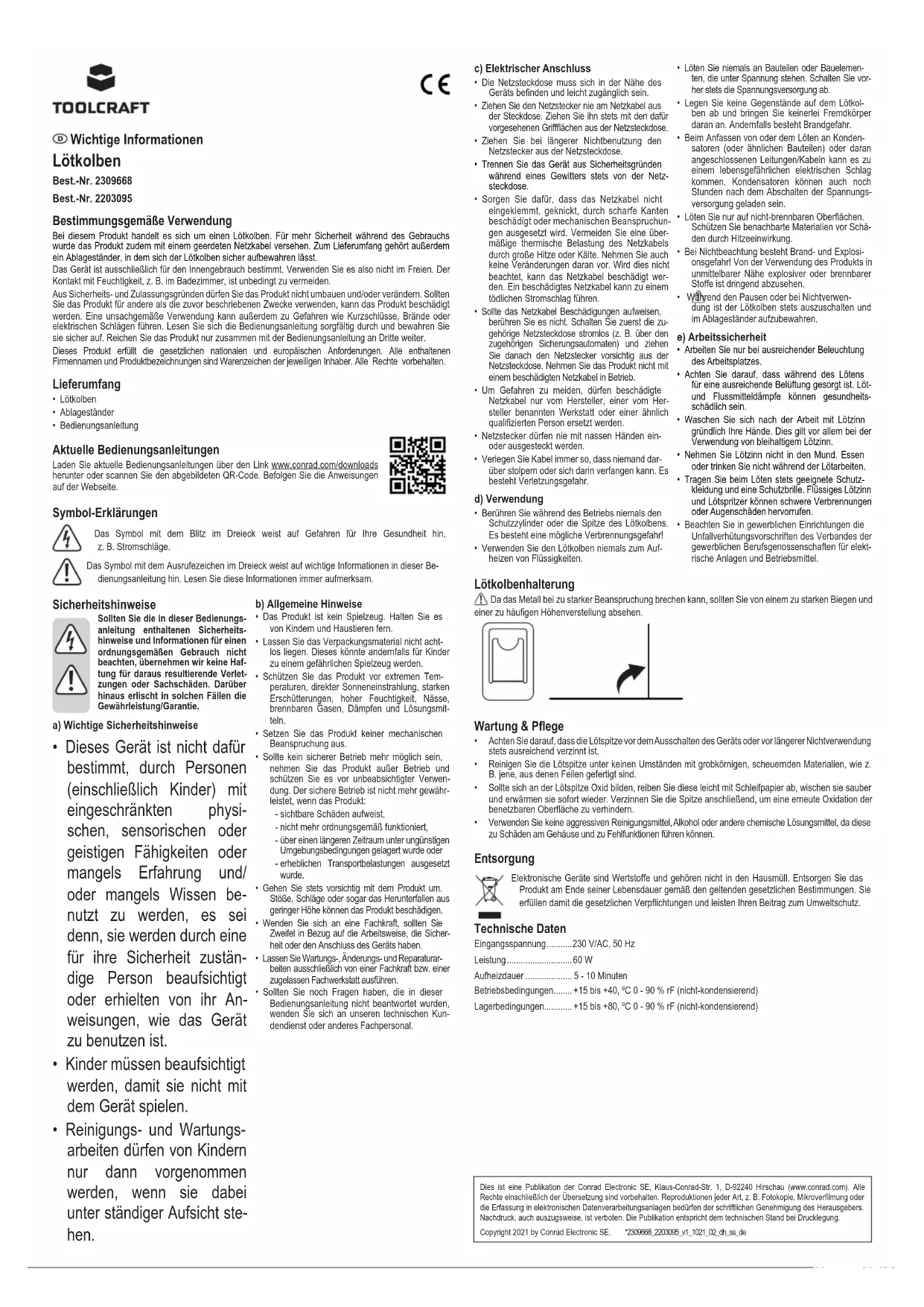 - N’utilisez pas de produits de nettoyage abrasifs, d’alcool à friction ou autre produit chimique ; ceux-ci risqueraient d’abîmer le boîtier et de causer des dysfonctionnements. Élimination des déchets Les appareils électroniques sont des déchets recyclables et ne doivent pas être mis au rebut avec les ordures ménagères. En n de vie, éliminez l’appareil conformément aux dispositions légales en vigueur. Ainsi, vous respectez les ordonnances légales et contribuez à la protection de l’environnement. Données techniques Tension d’entrée ................................. 230 V/CA, 50 Hz Puissance ....................................... 60 W Temps de chauffage .......................5 - 10 minutes Conditions de fonctionnement ........ +15 à +40 °C, 0 - 90 % HR (sans condensation) Conditions de stockage .................. +15 à +80 °C, 0 - 90 % HR (sans condensation) Informations Importantes Fer à souder N° de commande 2309668 N° de commande 2203095 Utilisation prévue Le produit est un fer à souder. Un câble d’alimentation mis à la terre offre une sécurité supplémentaire pendant l’utilisation. Il est livré avec un support de fer à souder et se branche directement sur une prise secteur. Il est uniquement destiné à une utilisation à l’intérieur. Ne l'utilisez pas à l’extérieur. Tout contact avec l'humidité, par ex. dans les salles de bains, doit être évité en toutes circonstances. Pour des raisons de sécurité et d’homologation, toute restructuration et/ou modication du produit est interdite. Toute utilisation à des ns autres que celles décrites ci-dessus pourrait endommager le produit. De plus, une mauvaise utilisation pourrait entraîner des risques tels que les courts-circuits, les incendies, les chocs électriques, etc. Lisez attentivement les instructions du mode d’emploi et conservez-le dans un endroit sûr. Ne mettez ce produit à la disposition de tiers qu’avec son mode d’emploi. Ce produit est conforme aux exigences nationales et européennes en vigueur. Tous les noms d’entreprises et appellations de produits sont des marques commerciales de leurs propriétaires respectifs. Tous droits réservés. Contenu de l’emballage
