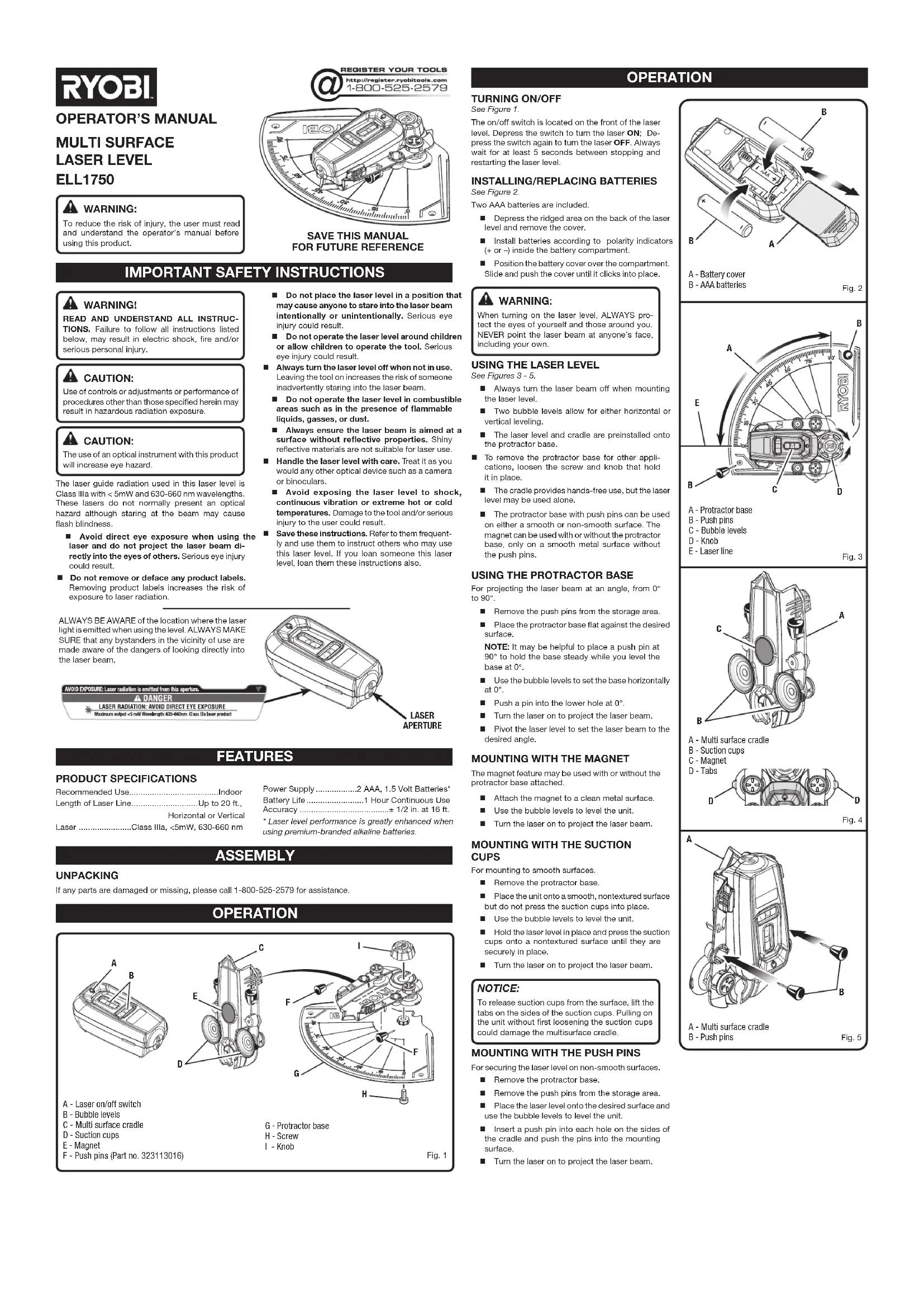 POUSSOIRS Pour sécuriser le niveau laser aux surfaces inégales. Retirer la base du rapporteur. Sortir les goupilles-poussoir de l’espace de rangement. Placer le niveau laser sur la surface désirée et utiliser les bulles pour niveler l’appareil. Insérer une goupille-poussoir dans chaque trou situé sur les côtés de la bride de fixation et enfoncer les goupilles-poussoirs dans la surface de montage. Allumer le laser et diriger le faisceau du laser vers le projet. OUVERTURE LASER ÉVITER L'EXPOSITION : Le rayonnement laser est émis de cette ouvertureDANGERÉviter l’exposition oculaire directe puissance maximale classe IIIa produit laser, < 5mW, 630-660 nm Français RYOBI est une marque de Ryobi Limited et est utilisée en vertu d’une licence accordée par Ryobi Limited. SERVICE This laser level has no serviceable parts. If the unit fails due to normal wear and tear within three years of purchase, return with original receipt for a replacement unit at no charge. TTI CONSUMER POWER TOOLS, INC. P.O. Box 1288, Anderson, SC 29622 • Phone 1-800-525-2579 États-Unis, Téléphone 1-800-525-2579 • USA, Teléfono 1-800-525-2579www.ryobitools.com TTI CONSUMER POWER TOOLS, INC. P.O. Box 1288, Anderson, SC 29622 Phone 1-800-525-2579 États-Unis, Téléphone 1-800-525-2579 USA, Teléfono 1-800-525-2579www.ryobitools.comABERTURA LÁSER Fig. 1 A - Interrupteur de marche/arrêt du laser, Interruptor de encendido/apagado del láser B - Bulles pour niveler, nivel de burbuja C - Bride de fixation multisurface, Soporte para distintas superficies D - Ventouse, Copas de aspiración E - Aimant, Imán F - Goupilles-poussoir, Pasadores (No de pièce 323113016, Núm. pieza 323113016) G - Base pour rapporteur, Base del transportador H - Vis, Tornillo I - Bouton, Perilla