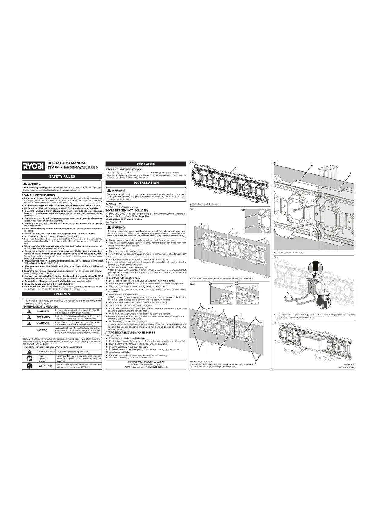 Apprendre à connaître le produit. Lire attentivement le manuel d’utilisation. Apprendre les applications et les limites de le produit, ainsi que les risques spécifiques relatifs à son utilisation. Le respect de cette consigne réduira les risques d’incendie, de choc électrique et de blessures graves. Le poids maximal de tous les objets placés sur chaque rail mural ne doit pas dépasser 93,44 kg (206 lb). Ne pas dépasser la capacité de poids maximale pour les rails muraux ou les accessoires. Fixer le rail mural au mur en suivant les instructions de ce manuel d’utilisation. Ne pas sécuriser correctement chaque rails muraux diminuera la capacité de poids maximale des rails muraux. Pour réduire tout risque de blessure, ne pas utiliser d’accessoires qui ne sont pas conçus ni recommandés spécialement par le fabricant. Il s’agit de rails muraux suspendus pour le garage. Ne pas utiliser pour tout autre but que le support d’outils ou de produits. Garder la zone autour les rails muraux propre et bien éclairée. Les endroits encombrés ou sombres sont propices aux accidents. Installer les rails muraux l’intérieur, dans un endroit sec et protégé contre toute condition humide. Garder les rails muraux sec, propre et exempt d’huile ou de graisse. Ne pas utiliser les rails muraux si elle est endommagée ou cassée. Les rails muraux endommagée ou cassée pourrait ne pas être montée solidement et ne pas soutenir adéquatement les objets qui y sont rangés. Utiliser exclusivement des pièces identiques à celles d’origine pour les réparations. L’utilisation de pièces non autorisées peut entraîner un risque de blessure. Installer les rails muraux sur des supports structurels solides. NE JAMAIS installer les rails muraux sur de la cloison sèche ou du plâtre avant d’avoir posé la pièce de fixation dans un support structurel. Une mauvaise installation des rails muraux représente un risque de chute pouvant causer des blessures graves ou mortelles. Installer les rails muraux sur des surfaces plates et lisses qui sont capables de supporter le poids des rails muraux et des objets qui y sont rangés. Être très prudent lors du montage de l’appareil. Toujours garder les pieds fermement au sol et être en équilibre en tout temps. S’assurer que les rails muraux sont correctement installés. Vérifier qu’ils ne balancent pas, ne glissent pas, ni ne bougent avant de ranger les produits ou les outils. Toujours porter une protection oculaire avec écrans latéraux certifiée conforme à la norme ANSI Z87.1 lors de l’installation de produit. Le respect de cette règle réduira les risques de blessures graves. Ne pas laisser les enfants ou les personnes n’ayant pas reçu une formation adéquate utiliser ces rails muraux. Garder les outils hors de la portée des enfants. CONSERVER CES INSTRUCTIONS. Les consulter fréquemment et les utiliser pour instruire d’autres utilisateurs. Si cet outil est prêté, il doit être accompagné de ces instructions. ADVERTENCIA: Lea todas las advertencias de seguridad y todas las instrucciones. No seguir las advertencias e instrucciones podría resultar en electrocución, incendio y/o lesiones graves.