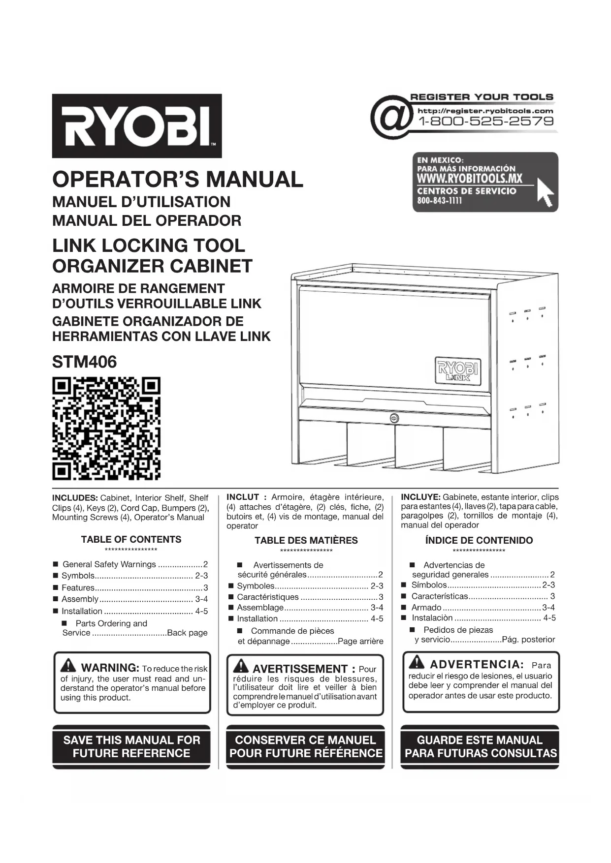 *Model number on product may have additional letters at the end. These letters designate manufacturing information and should be provided when calling for service. Pour faire une demande de réparations ou obtenir des pièces de rechange, trouver un Centre de réparations agréé pour obtenir un soutien technique ou le Service à la clientèle : Visiter www.ryobitools.com ou en téléphonant au 1-800-525-2579 Si des pièces ou accessoires sont manquantes ou endommagées, ne pas retourner ce produit au magasin. Appeler immédiatement au 1-800-525-2579 pour obtenir de l’aide. Inscrire les numéros de modèle et de série inscrits sur la plaque d’identication du produit. Ce produit est couvert par une Garantie Limitée à Vie. Une preuve d’achat est exigée. NUMÉRO DE MODÈLE* _______________ NUMÉRO DE SÉRIE ____________________________ *Le numéro de modèle sur le produit peut contenir des lettres supplémentaires à la fin. Ces lettres désignent les informations du fabricant et doivent être fournies lors d’un appel de demande de service.