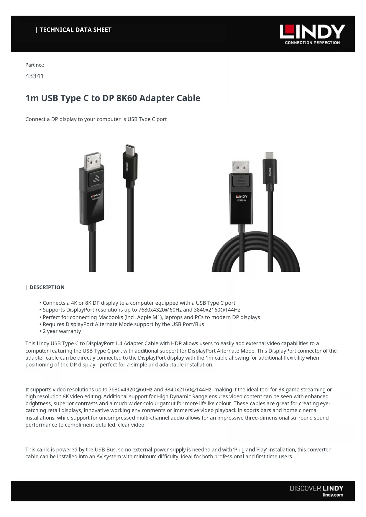 Câble adaptateur USB Type C vers DisplayPort 8K60, 1m Connectez un affichage DP au port USB Type C de votre ordinateur Connecte un écran DP 4K et 8K à un ordinateur équipé d'un port USB de type C Prend en charge les résolutions DisplayPort jusqu'à 7680x4320 60Hz et 3840x2160 144Hz Parfait pour connecter les Macbooks (y compris Apple M1), les ordinateurs portables et les PC aux écrans DP modernes Nécessite la prise en charge de la fonction DisplayPort Alternate Mode par le port USB/bus Garantie 2 ans Ce câble adaptateur USB Type C vers DisplayPort 1.4 avec HDR de LINDY permet aux utilisateurs d'ajouter facilement des capacités vidéo externes à un ordinateur équipé d'un port USB Type C qui prend en charge la fonction DisplayPort Alternate Mode. Le connecteur DisplayPort du câble adaptateur peut être directement connecté à l'écran DisplayPort avec le câble de 1m, ce qui permet une flexibilité supplémentaire lors du positionnement de l'écran DP - parfait pour une installation simple et adaptable. Il prend en charge les résolutions vidéo 8K 7680x4320@60Hz et 4K144Hz, ce qui en fait l'outil idéal pour le streaming de jeux 8K ou le montage vidéo 8K haute résolution. La prise en charge supplémentaire de la gamme dynamique élevée (HDR) garantit que le contenu vidéo peut être vu avec une luminosité améliorée, des contrastes supérieurs et une gamme de couleurs beaucoup plus large, pour des couleurs plus réalistes. Ces câbles sont parfaits pour la création d’affichages publicitaires accrocheurs, d'environnements de travail innovants ou pour la lecture vidéo immersive dans les bars sportifs et les installations de home cinéma, tandis que la prise en charge de l'audio multicanal non compressé permet d'obtenir un son surround tridimensionnel impressionnant pour compléter une vidéo claire et détaillée. Ce câble est alimenté par le bus USB, donc aucune alimentation externe n'est nécessaire. Avec l'installation "Plug and Play", ce câble convertisseur peut être installé dans un système AV avec un minimum de difficultés, idéal pour les professionnels et les nouveaux utilisateurs.
