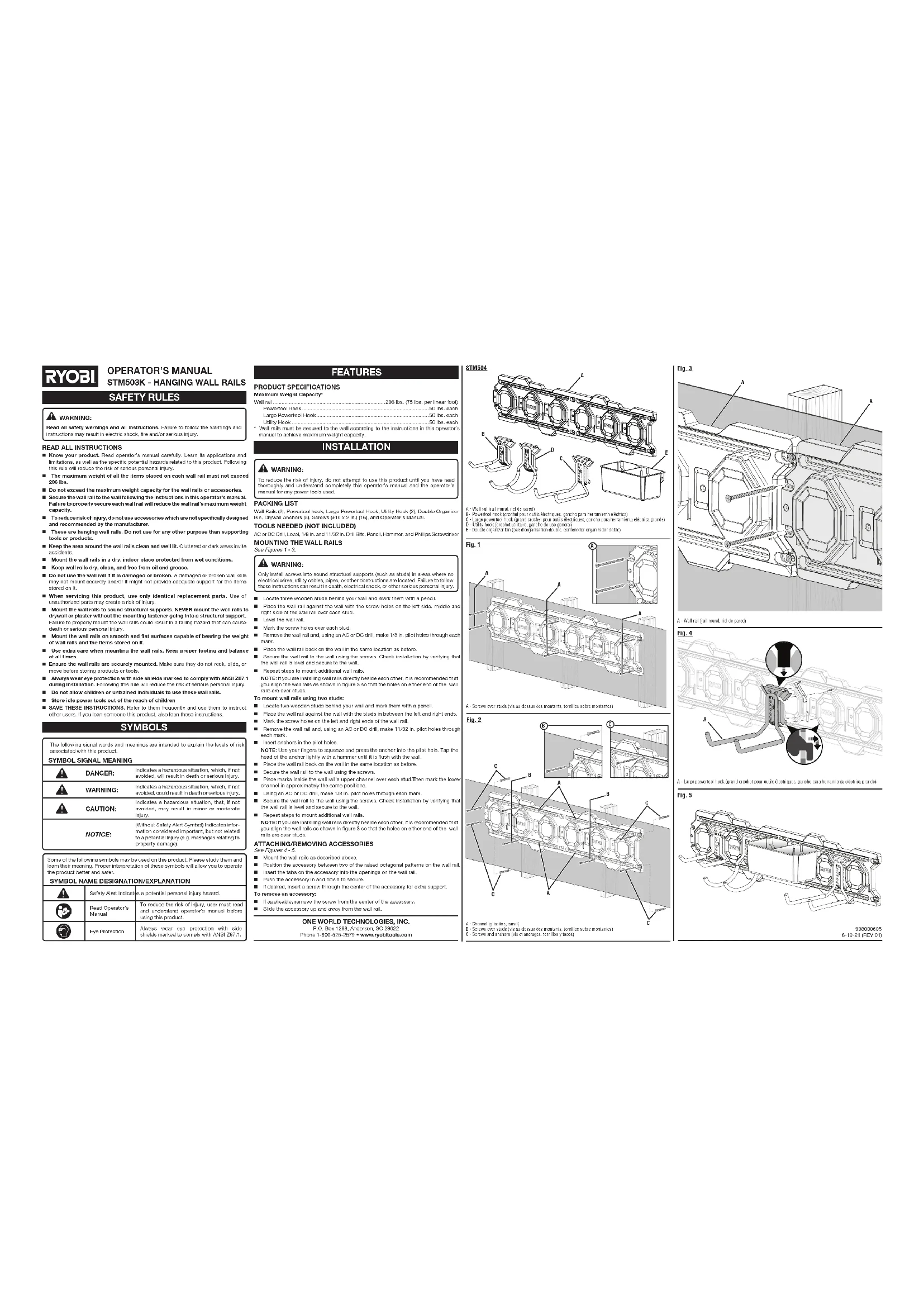 Apprendre à connaître le produit. Lire attentivement le manuel d’utilisation. Apprendre les applications et les limites de le produit, ainsi que les risques spécifiques relatifs à son utilisation. Le respect de cette consigne réduira les risques d’incendie, de choc électrique et de blessures graves.Le poids maximal de tous les objets placés sur chaque rail mural ne doit pas dépasser 93,44 kg (206 lb). Ne pas dépasser la capacité de poids maximale pour les rails muraux ou les accessoires. Fixer le rail mural au mur en suivant les instructions de ce manuel d’utilisation. Ne pas sécuriser correctement chaque rails muraux diminuera la capacité de poids maximale des rails muraux. Pour réduire tout risque de blessure, ne pas utiliser d’accessoires qui ne sont pas conçus ni recommandés spécialement par le fabricant. Il s’agit de rails muraux suspendus pour le garage. Ne pas utiliser pour tout autre but que le support d’outils ou de produits. Garder la zone autour les rails muraux propre et bien éclairée. Les endroits encombrés ou sombres sont propices aux accidents. Installer les rails muraux l’intérieur, dans un endroit sec et protégé contre toute condition humide.Garder les rails muraux sec, propre et exempt d’huile ou de graisse. Ne pas utiliser les rails muraux si elle est endommagée ou cassée. Les rails muraux endommagée ou cassée pourrait ne pas être montée solidement et ne pas soutenir adéquatement les objets qui y sont rangés. Utiliser exclusivement des pièces identiques à celles d’origine pour les réparations. L’utilisation de pièces non autorisées peut entraîner un risque de blessure. Installer les rails muraux sur des supports structurels solides. NE JAMAIS installer les rails muraux sur de la cloison sèche ou du plâtre avant d’avoir posé la pièce de fixation dans un support structurel. Une mauvaise installation des rails muraux représente un risque de chute pouvant causer des blessures graves ou mortelles. Installer les rails muraux sur des surfaces plates et lisses qui sont capables de supporter le poids des rails muraux et des objets qui y sont rangés.Être très prudent lors du montage de l’appareil. Toujours garder les pieds fermement au sol et être en équilibre en tout temps. S’assurer que les rails muraux sont correctement installés. Vérifier qu’ils ne balancent pas, ne glissent pas, ni ne bougent avant de ranger les produits ou les outils. Toujours porter une protection oculaire avec écrans latéraux certifiée conforme à la norme ANSI Z87.1 lors de l’installation de produit. Le respect de cette règle réduira les risques de blessures graves.Ne pas laisser les enfants ou les personnes n’ayant pas reçu une formation adéquate utiliser ces rails muraux.Garder les outils hors de la portée des enfants. CONSERVER CES INSTRUCTIONS. Les consulter fréquemment et les utiliser pour instruire d’autres utilisateurs. Si cet outil est prêté, il doit être accompagné de ces instructions.